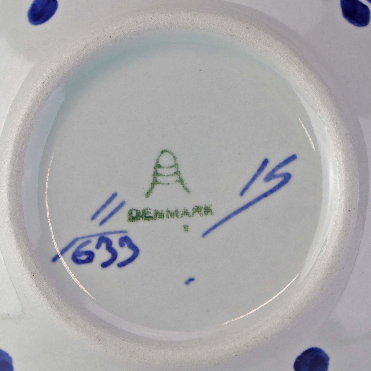 Glat hvid fajance med blå dekoration af blomster og blå bort.
