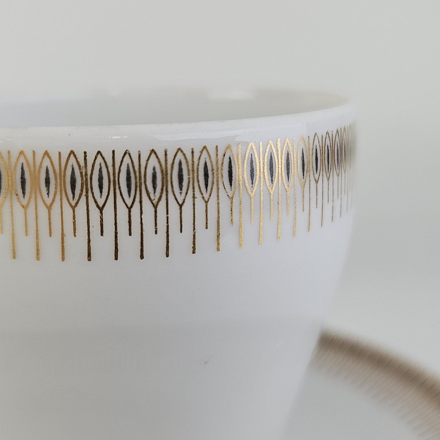 Kop med underkop i hvidt porcelæn med dekoration i guld fra stellet Trend 1220