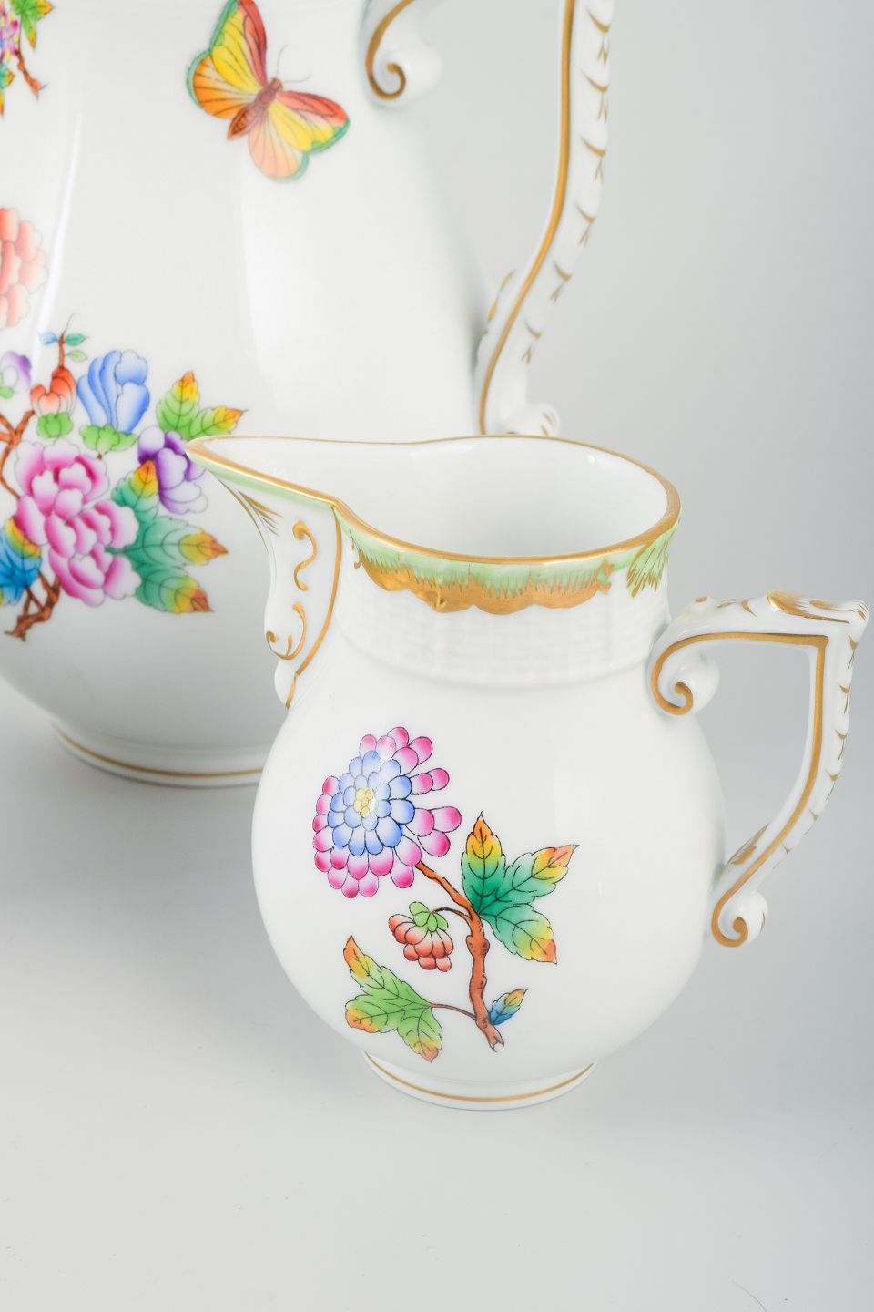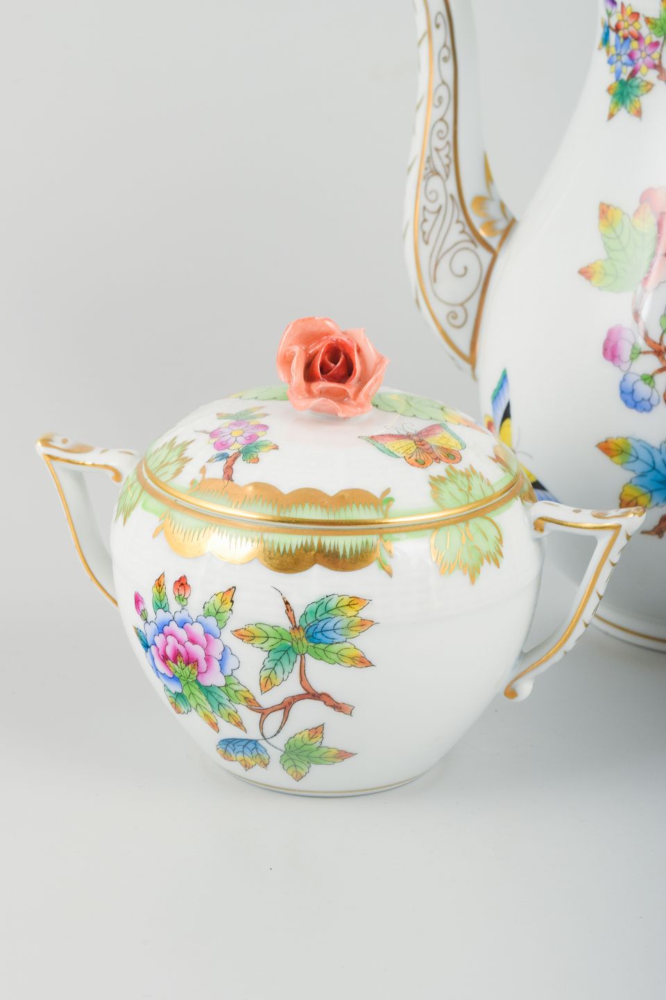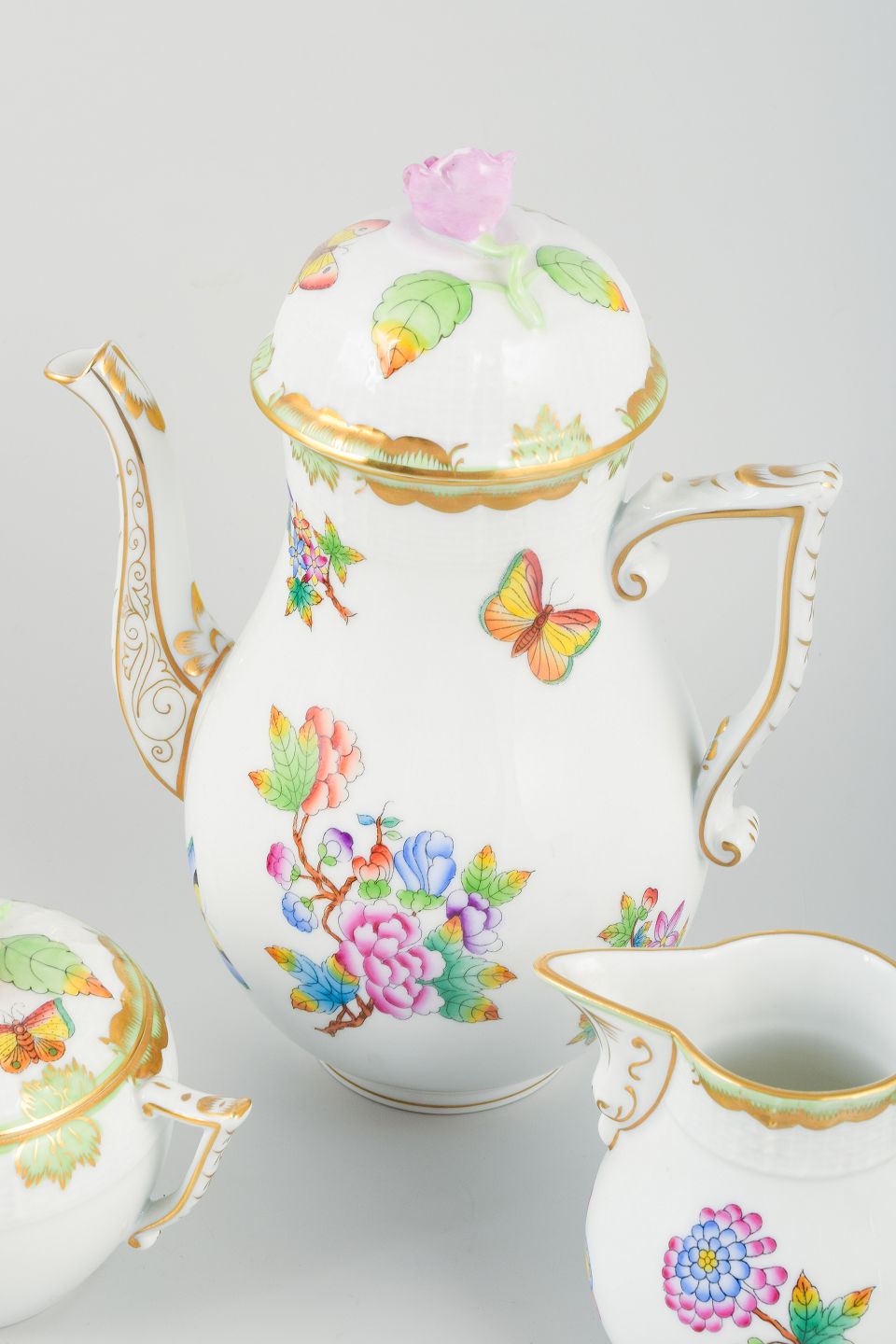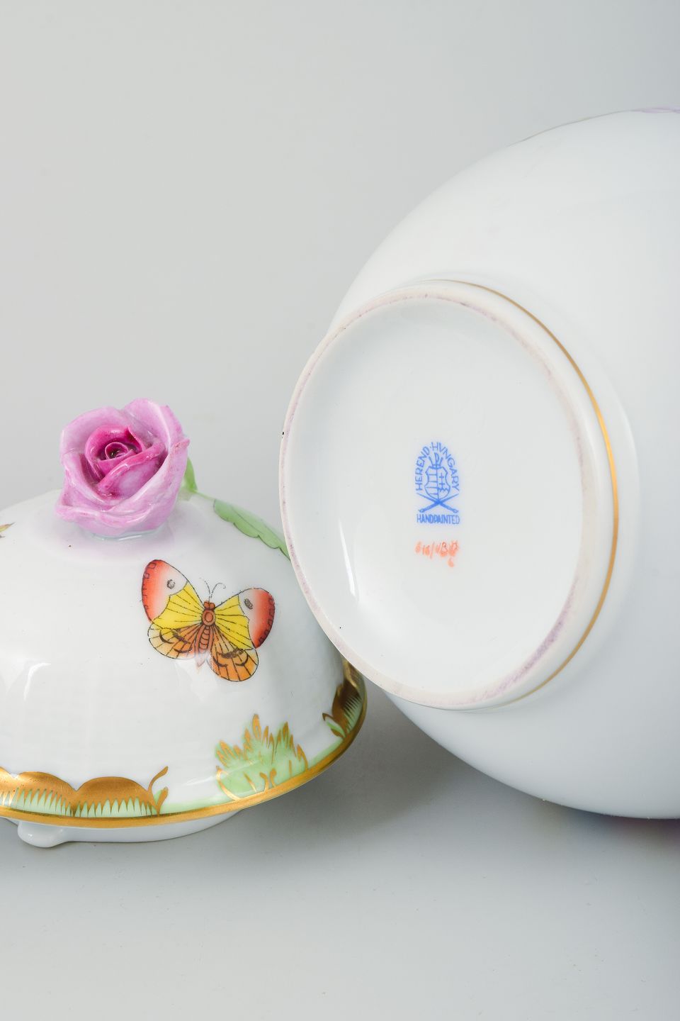 Herend Porcelænsfabrik i Ungarn blev grundlagt i 1826 og er kendt for sit fine håndmalede porcelæn. Et af de mest berømte mønstre er “Queen Victoria”, designet i 1851 til Verdensudstillingen i London, hvor Dronning Victoria købte et spisestel i dette mønster – deraf navnet. Dekorationen består af farverige sommerfugle og blomster inspireret af kinesisk porcelæn, og det er stadig et af Herends mest ikoniske og populære designs.