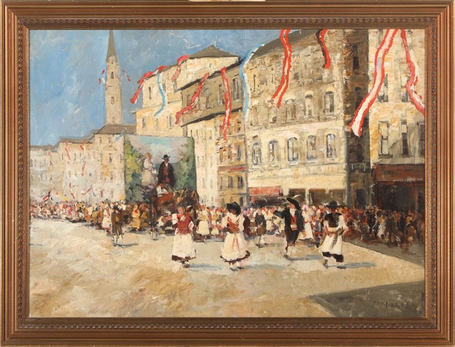 Ruzicka-Lautenschläger, Hans (1862 - 1933) Österreich: Menschenumzug am Neuen Markt, Wien. Öl auf Leinwand. Unterzeichnet. 58 x 79 cm.