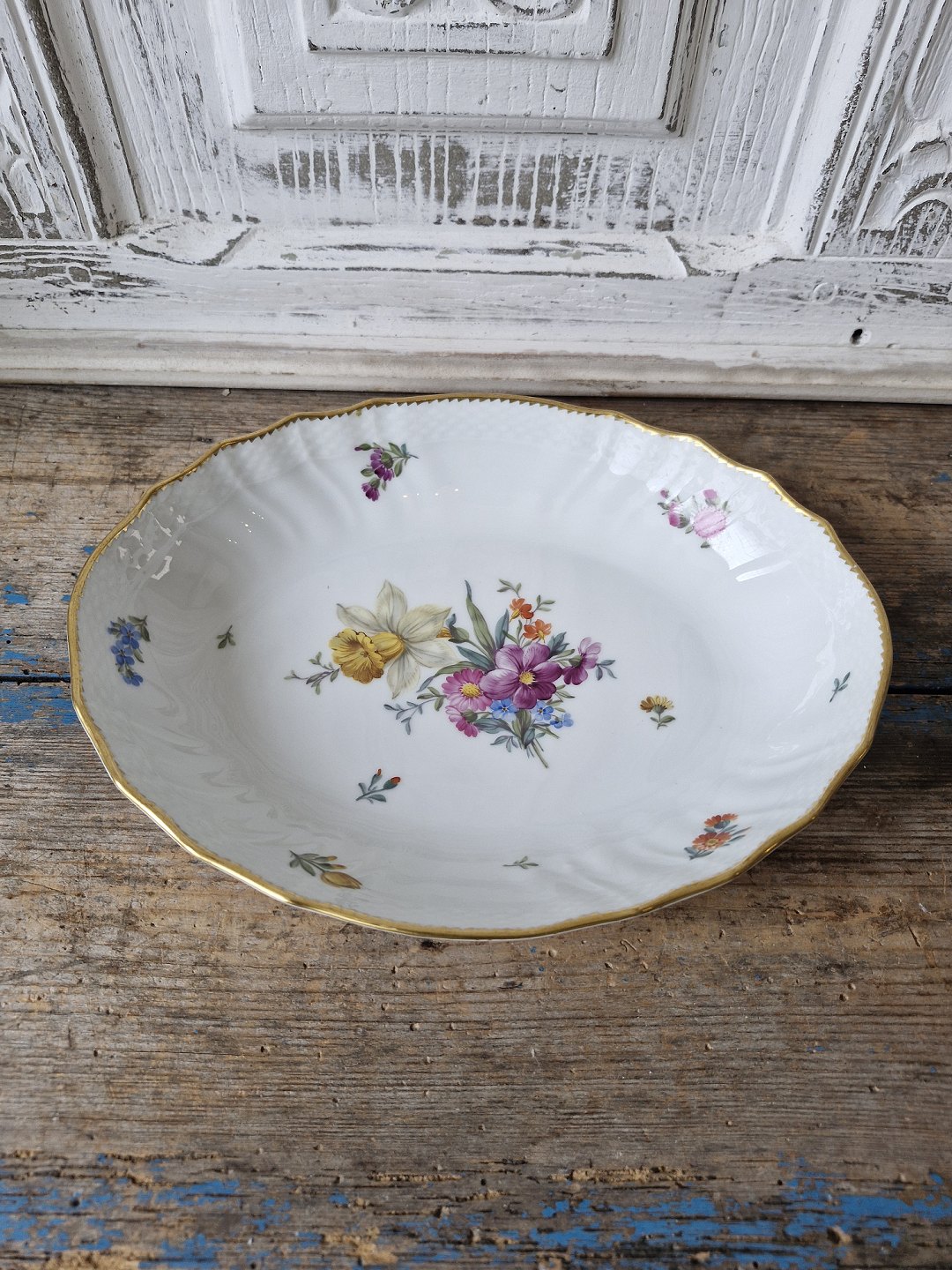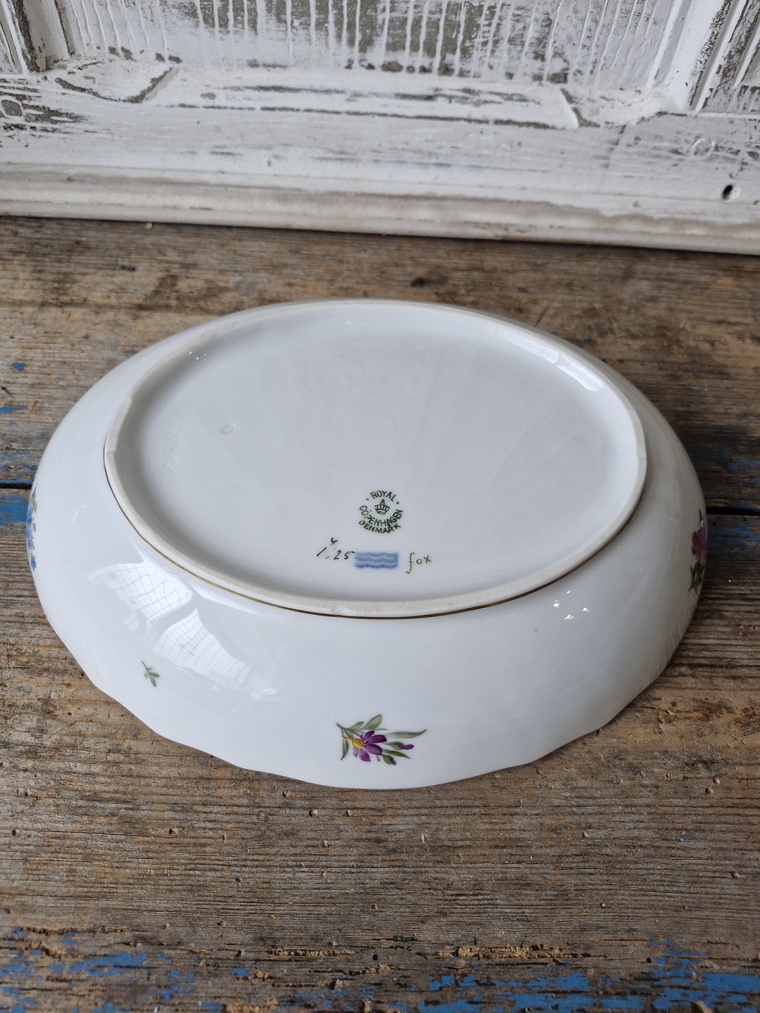 Text zugänglich auf Dänische: Royal Copenhagen Fuld Saksisk Blomst oval skål no. 1525