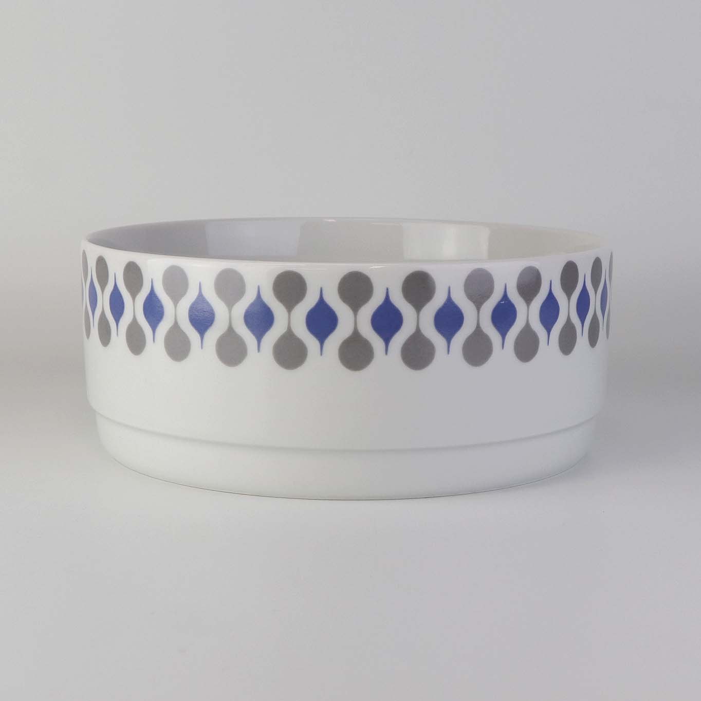 Stel produceret i perioden 1961-69 fremstillet i glat hvidt porcelæn dekoreret med blå og grå dråber.