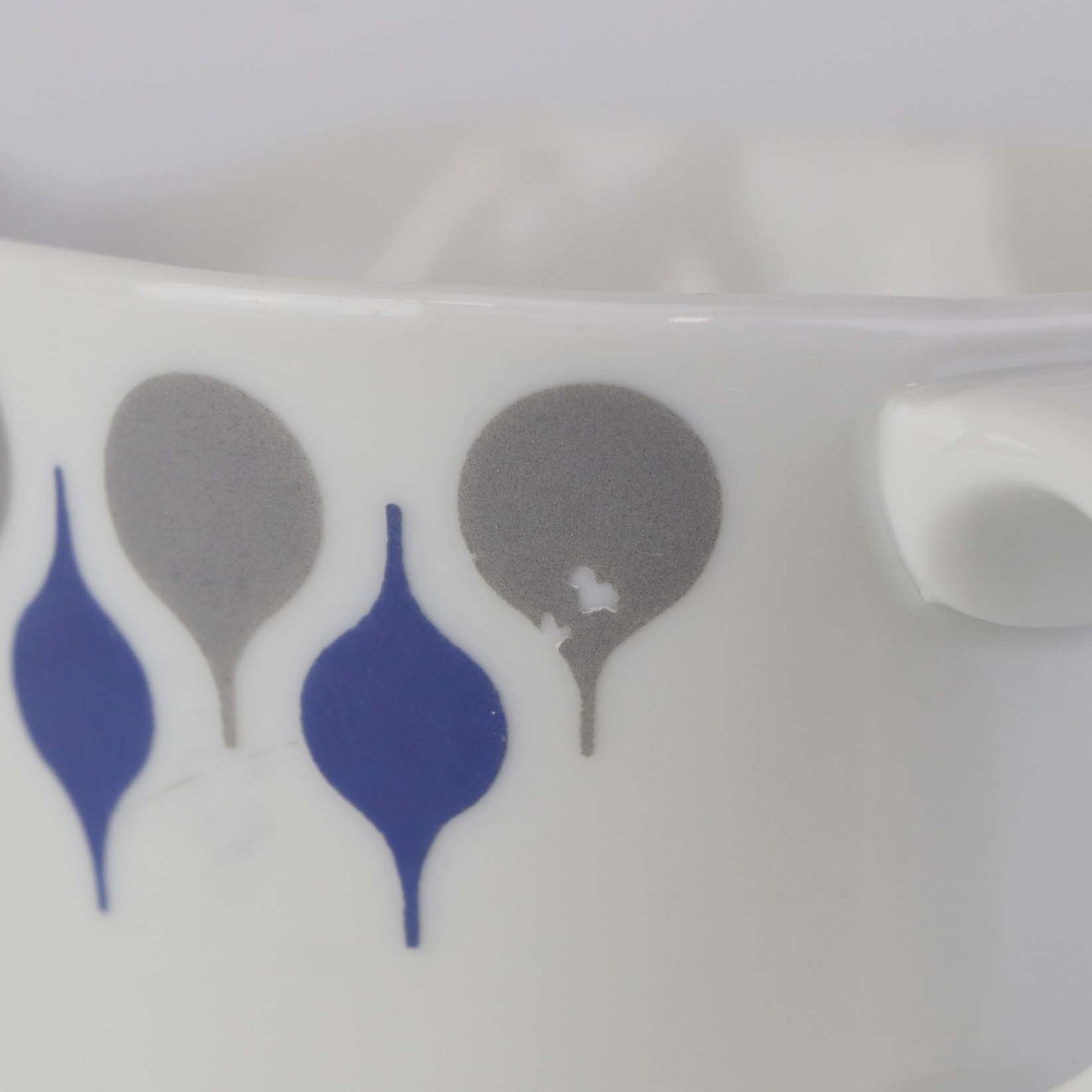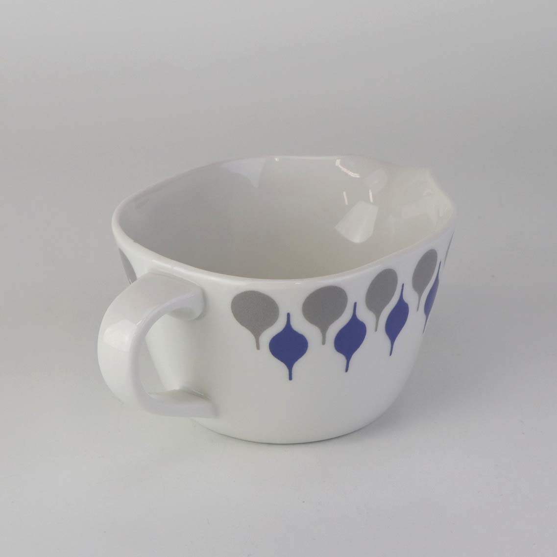 Stel produceret i perioden 1961-69 fremstillet i glat hvidt porcelæn dekoreret med blå og grå dråber.