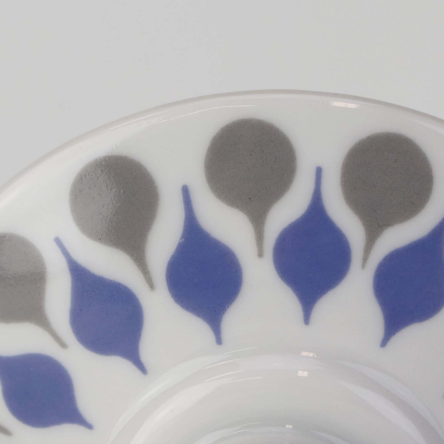 Stel produceret i perioden 1961-69 fremstillet i glat hvidt porcelæn dekoreret med blå og grå dråber.