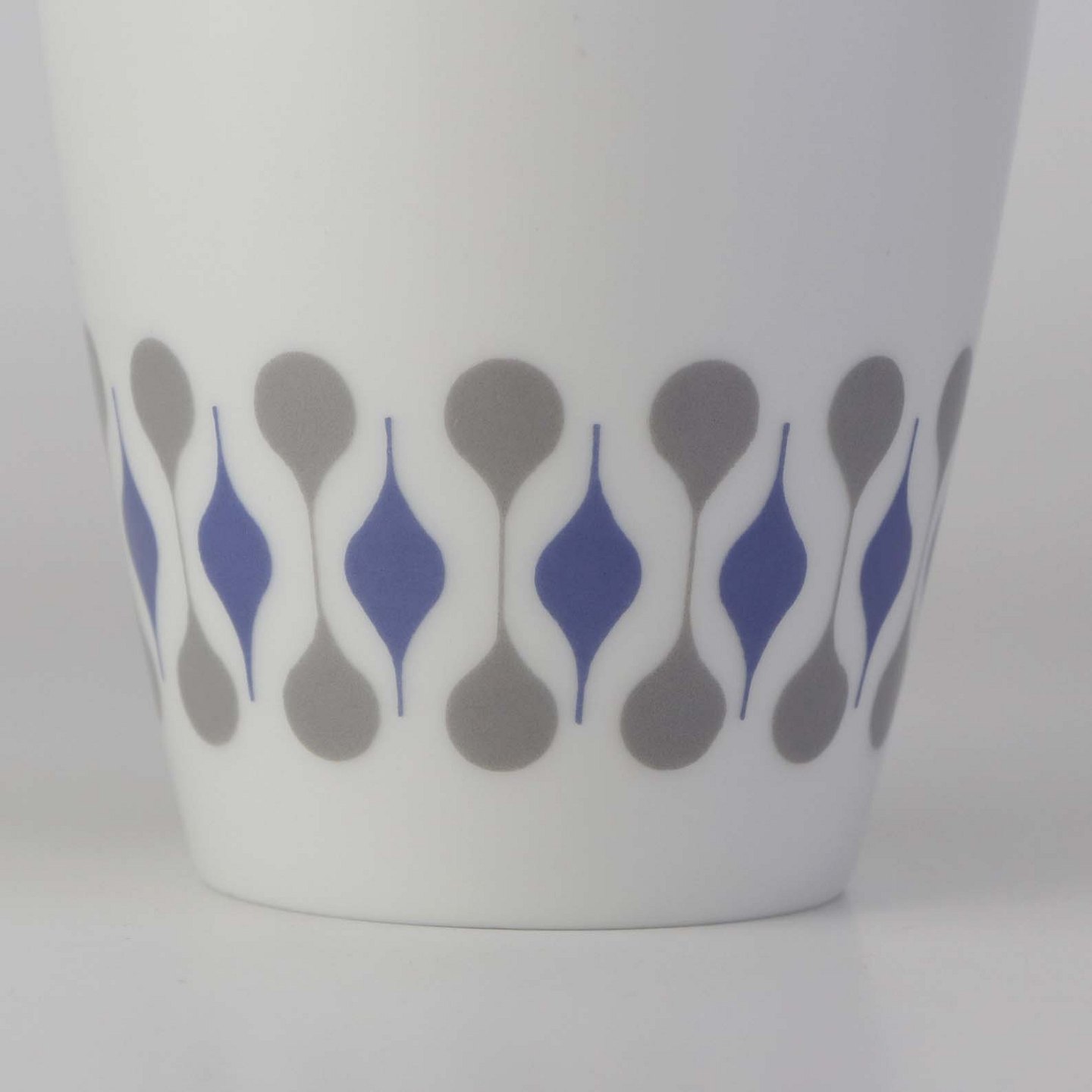 Stel produceret i perioden 1961-69 fremstillet i glat hvidt porcelæn dekoreret med blå og grå dråber.