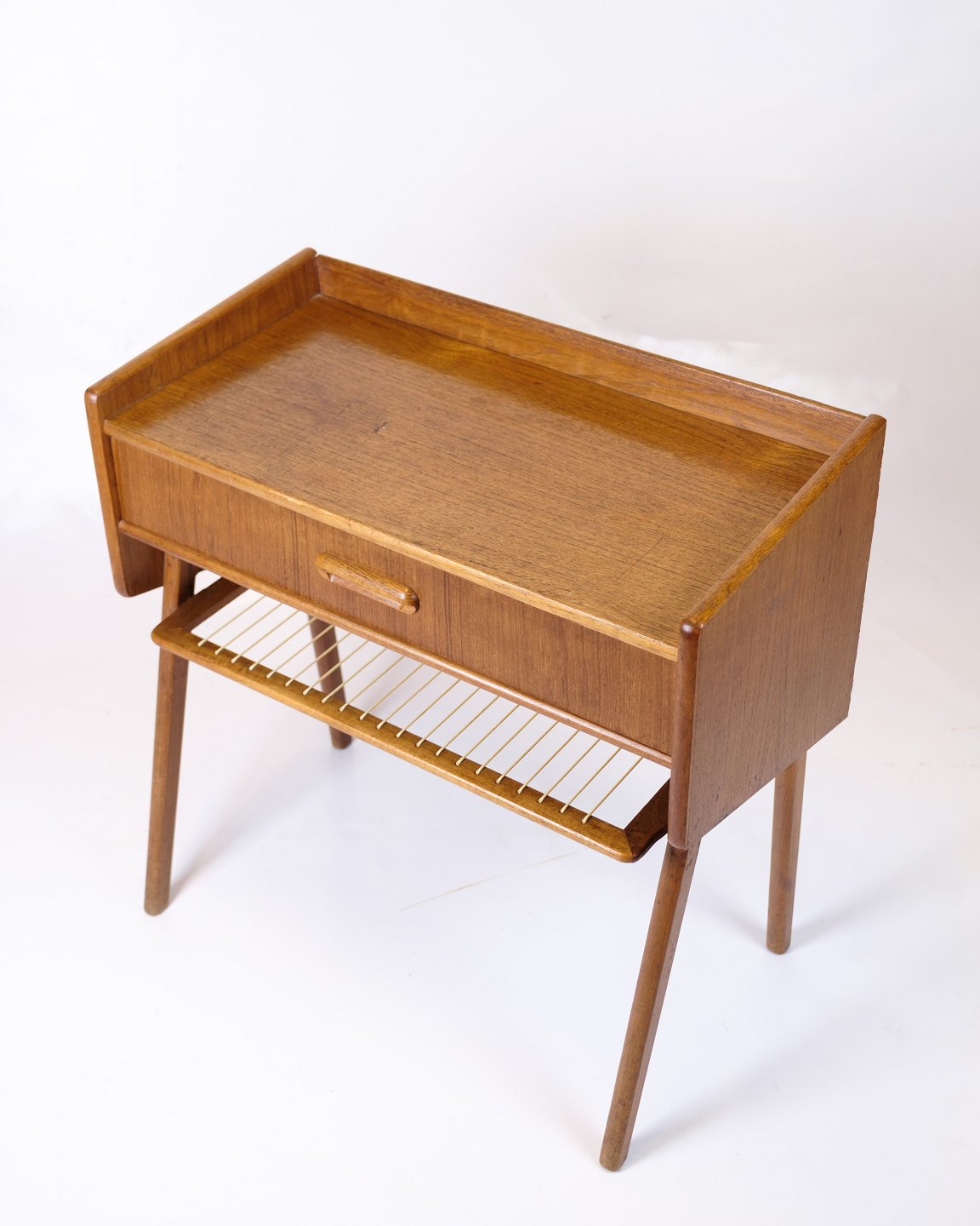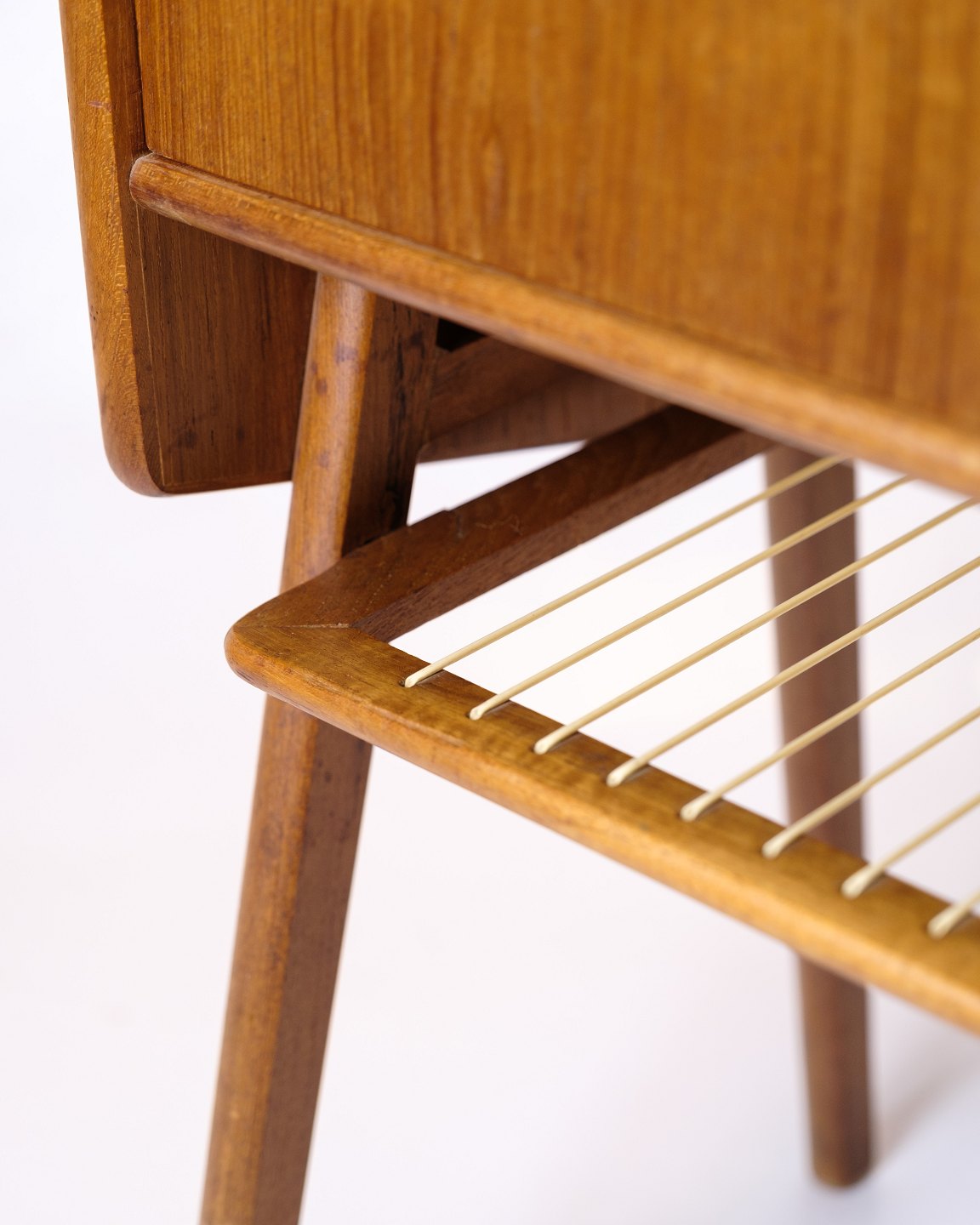 Text zugänglich auf Dänische: Sidebord/natbord i teaktræ med skuffe og flethylde. Dansk design fra 1960’erne. Elegant og funktionelt møbel i flot stand.