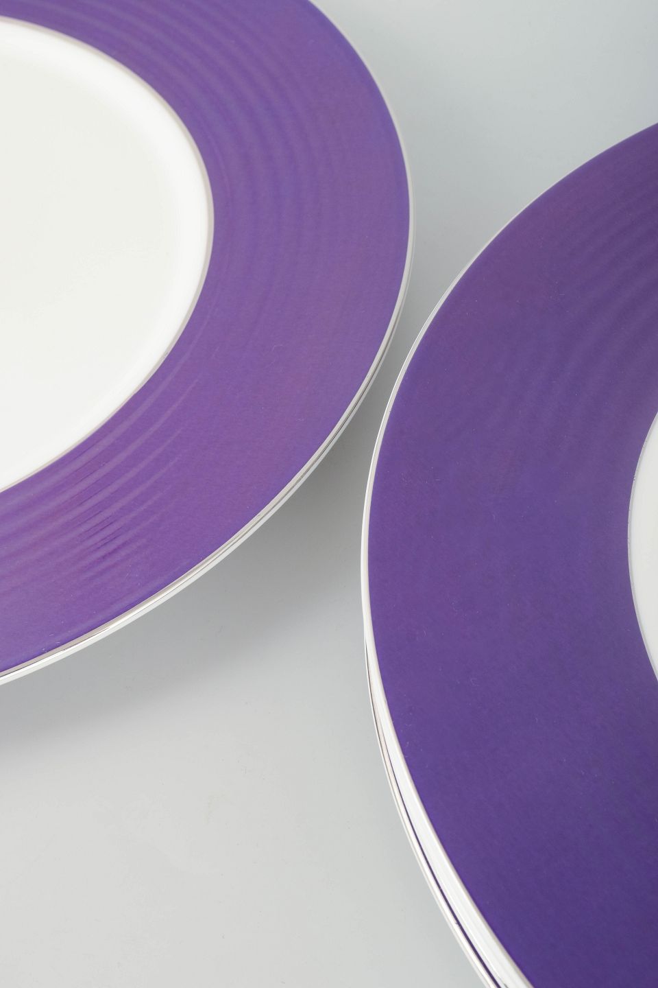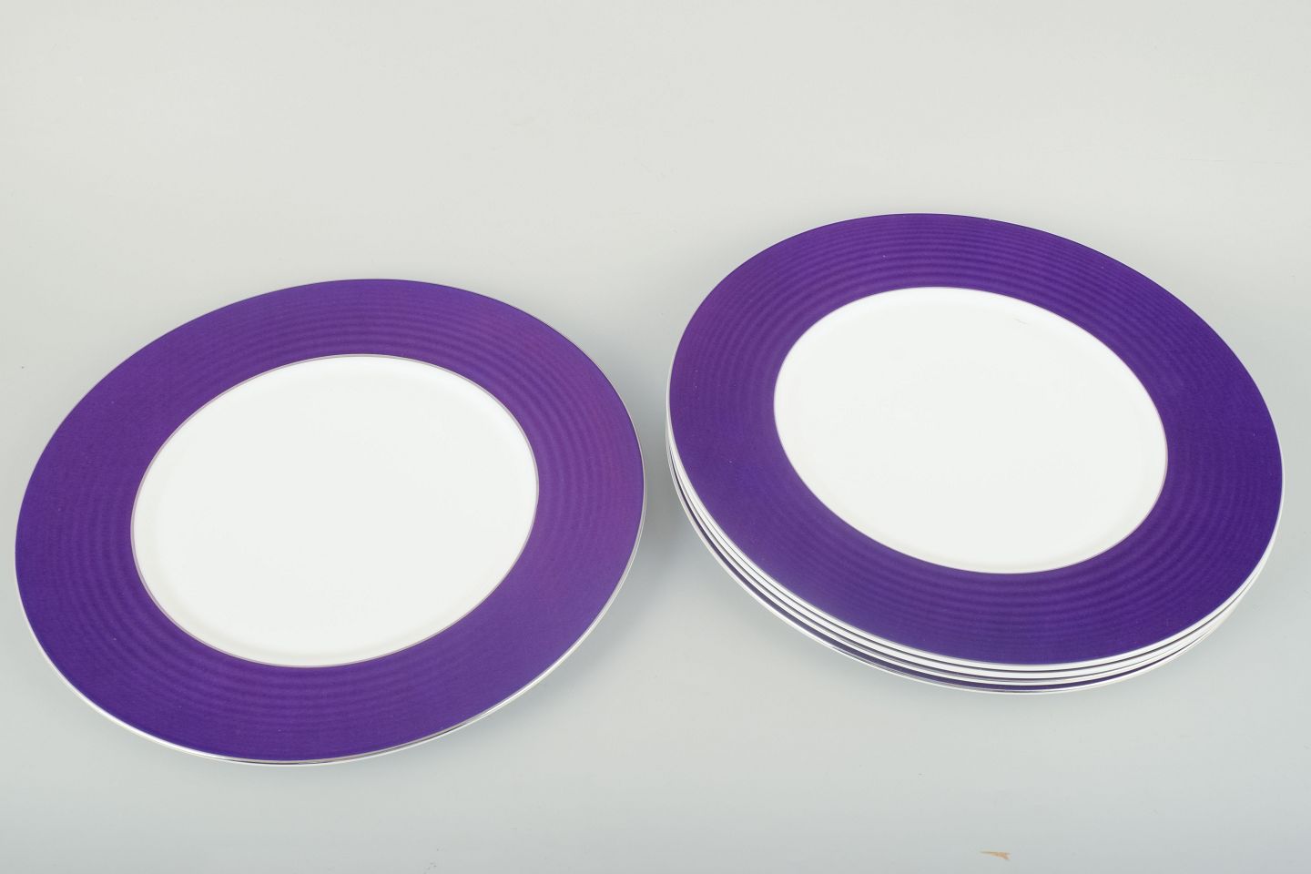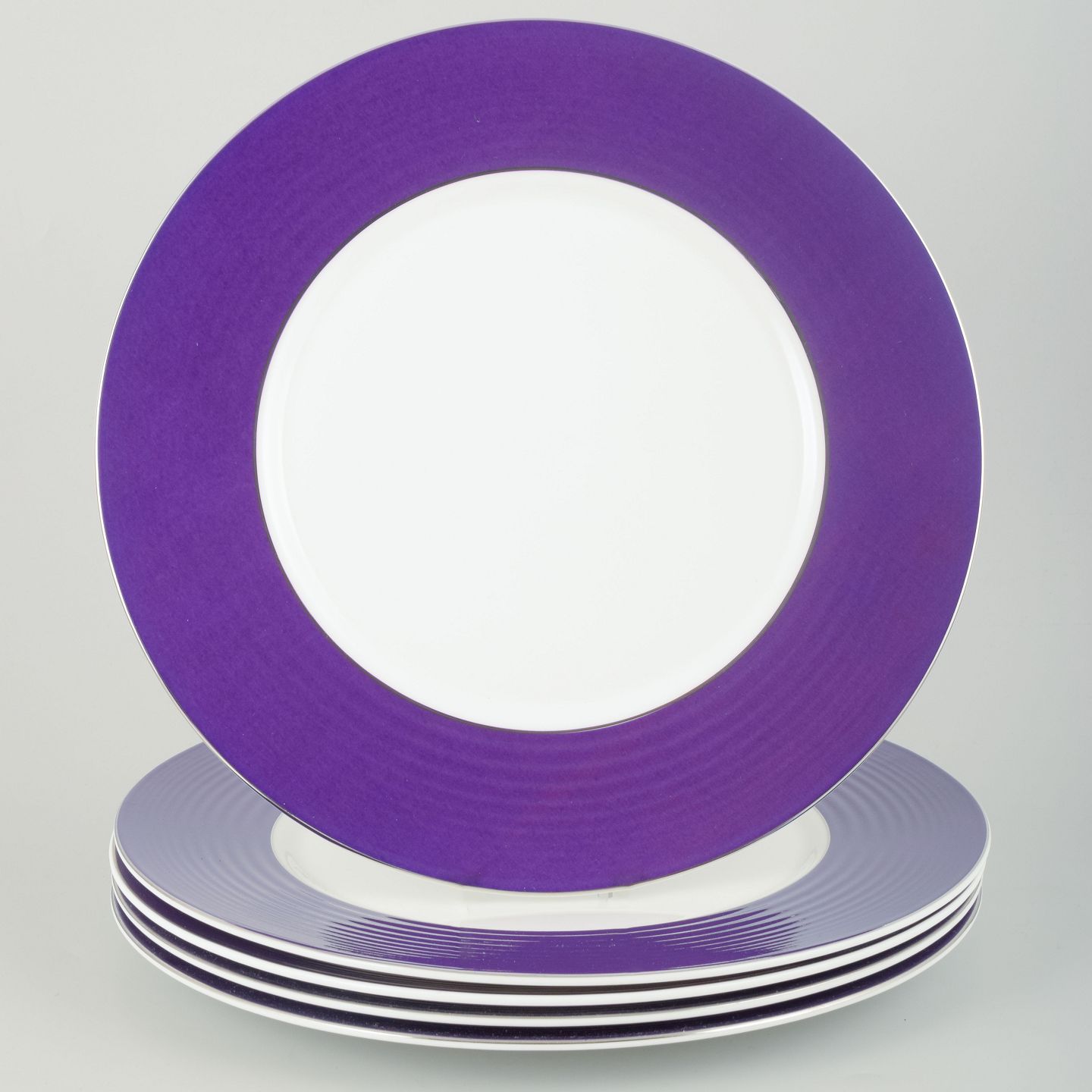 Five large dinner plates designed by Gordon Ramsay for Royal Doulton. Classic modern design with a white center and a broad, deep purple rim, adding both refinement and a bold, contemporary expression. Executed in high-quality porcelain, the simple decoration highlights their functional elegance.