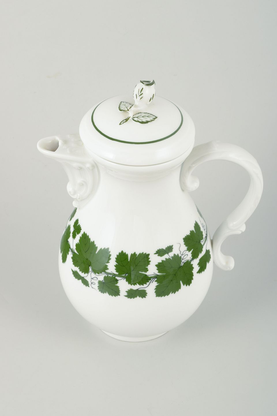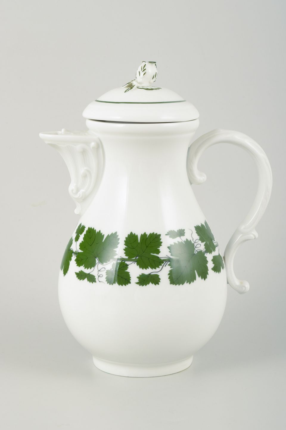 Porcelænskande med låg fra Meissen, dekoreret i det klassiske Vine-Leaf Pattern (“Voller grüner Weinkranz”) med grønne vinblade og slyngende ranker i underglasur. Dekorationen er udført med præcise, levende penselstrøg, som elegant følger kandens svungne form. Låget er afsluttet med knop i form af et vinblad, og den dekorative hank og tud understreger helhedens harmoniske balance.