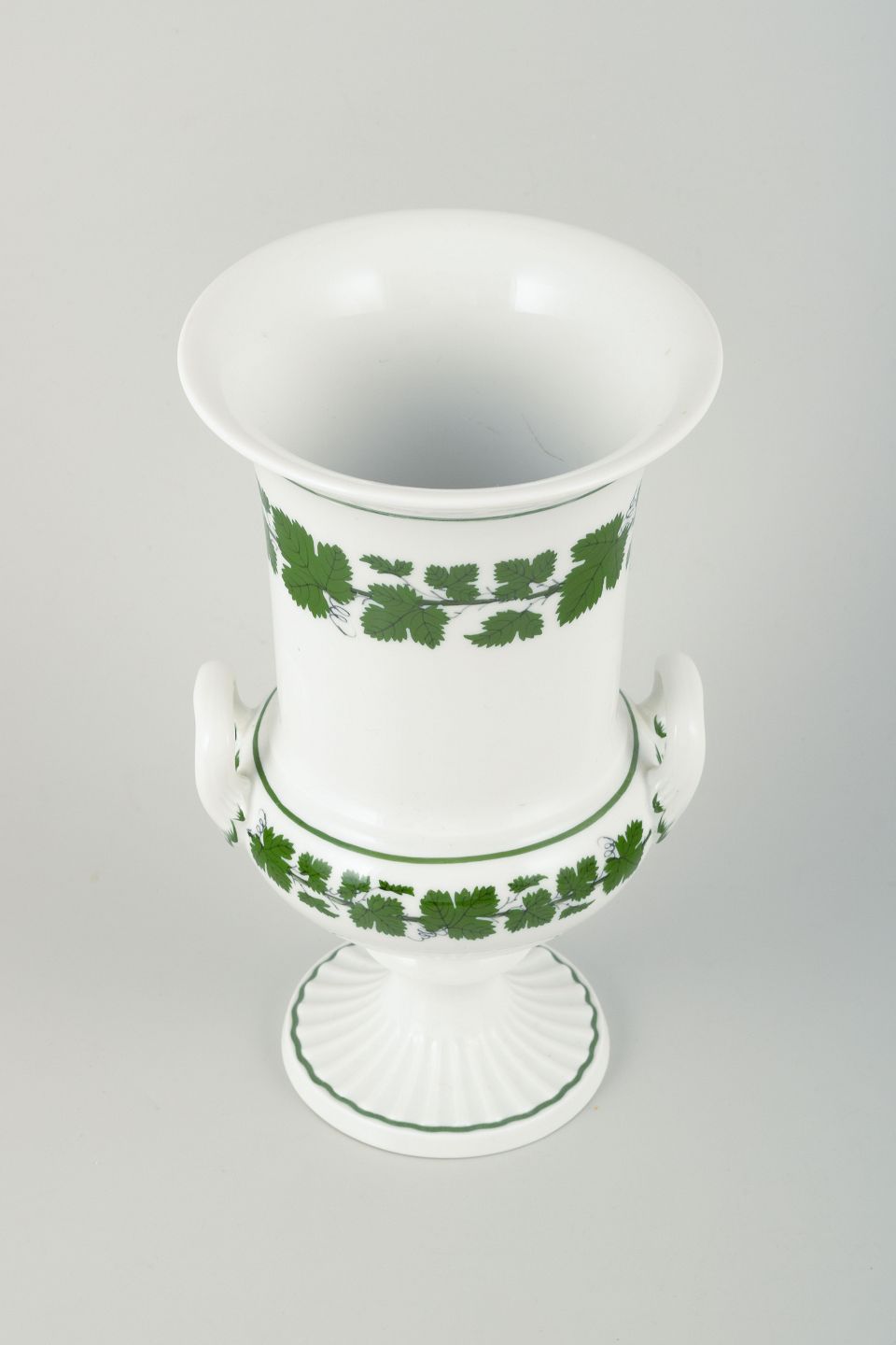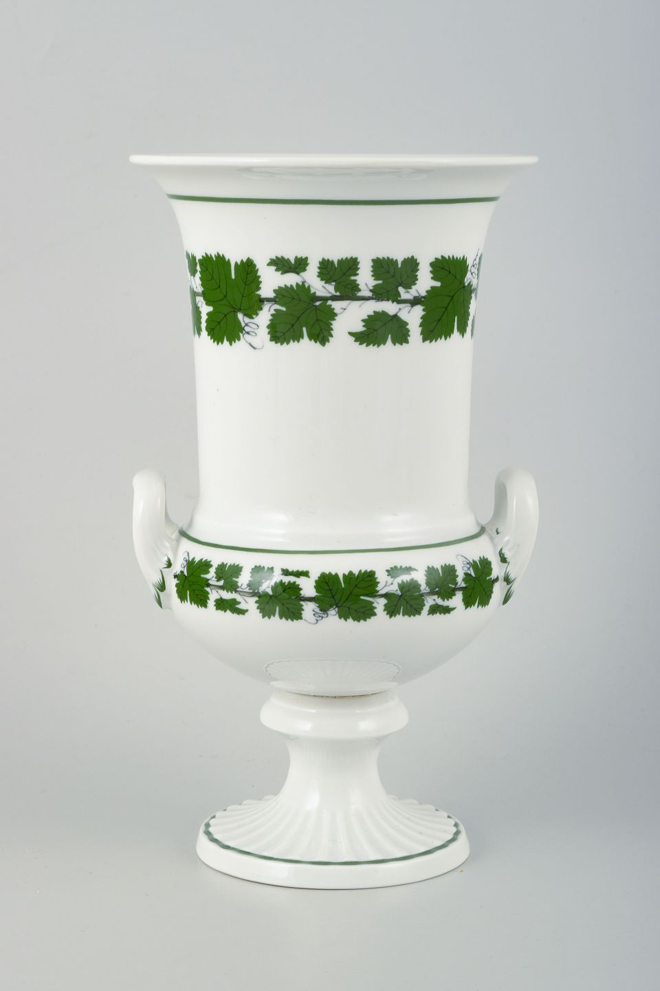 Elegant Meissen-vase på fod, dekoreret med det klassiske Vine-Leaf Pattern (“Voller grüner Weinkranz”), hvor grønne vinblade og slyngende ranker danner en livfuld krans omkring vasens krop. De svungne sidehanke fuldender helheden og giver vasen en monumental, men samtidig harmonisk fremtoning.