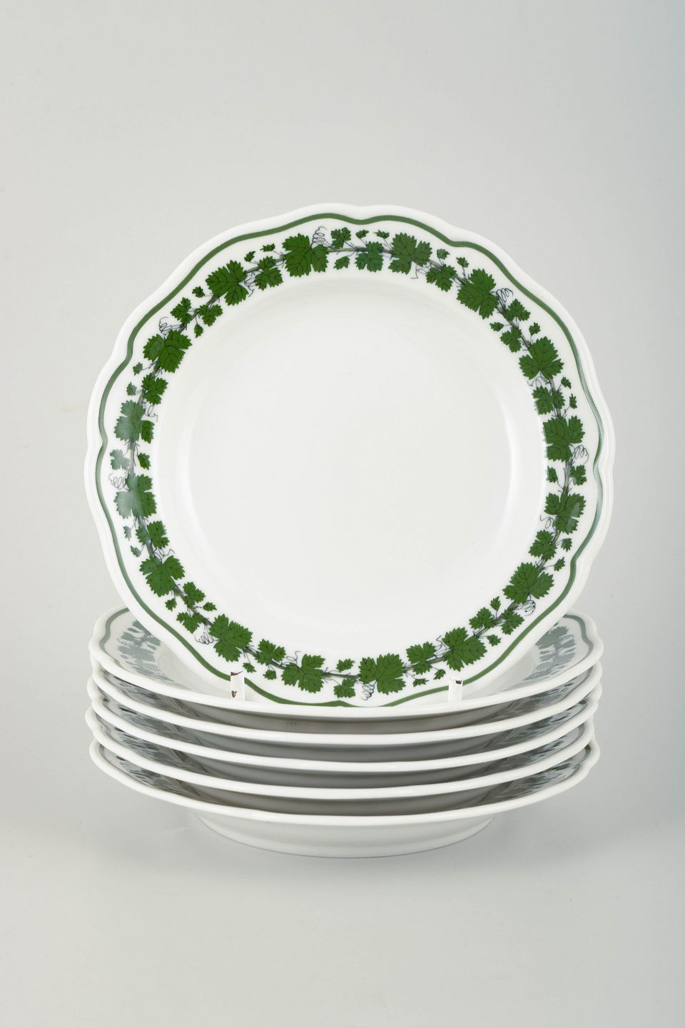 Sæt med 6 små tallerkener fra Meissen, dekoreret i det klassiske Vine-Leaf Pattern (“Voller grüner Weinkranz”) med grønne vinblade og ranker i underglasur. Den elegante bølgekant understøtter den dekorative bort og skaber en tidløs helhed.