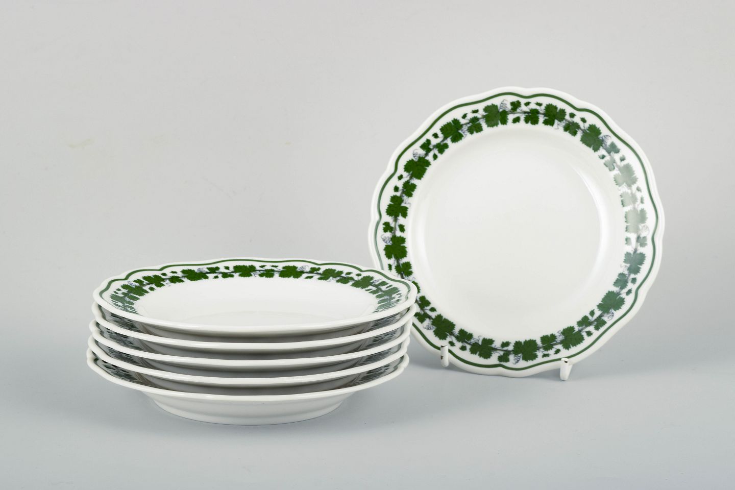 Meissen Porzellan, grundlagt i 1710, var Europas første porcelænsfabrik og blev hurtigt berømt for sit uovertrufne håndværk og kunstneriske innovation. Blandt fabrikkens mange ikoniske stel er Vine-Leaf Pattern, på tysk Voller grüner Weinkranz, introduceret omkring 1817 af Johann Samuel Arnhold. Dekorationen med grønne vinblade og slyngende ranker blev et af Meissens mest populære mønstre og fortsatte ind i det 20. århundrede. Stellet repræsenterer fabrikkens fascination af naturens ornamentik og det præcise håndmalede udtryk, som har gjort Meissen til et symbol på europæisk porcelænstradition.