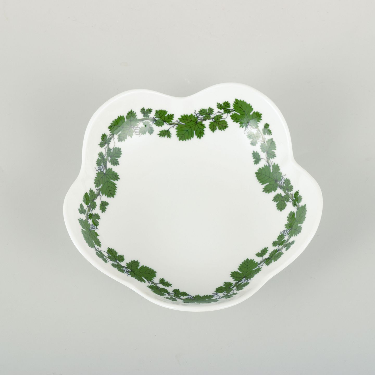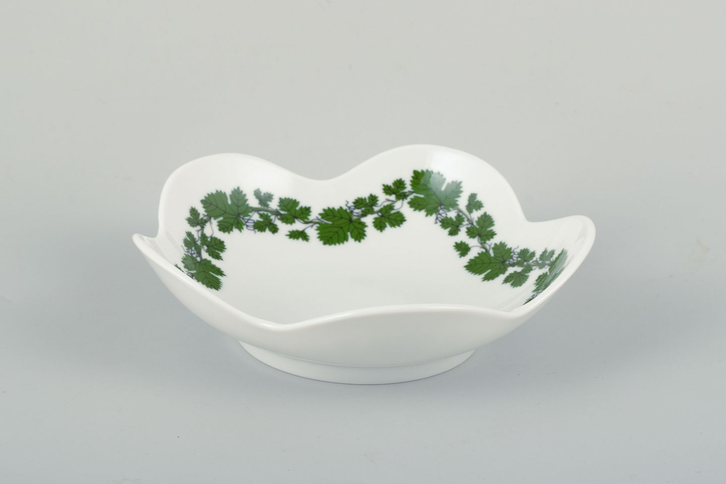 Porcelænsskål fra Meissen, dekoreret i Vine-Leaf Pattern (“Voller grüner Weinkranz”). Skålen er formet med bløde, svungne kanter og dekoreret med den karakteristiske bort af grønne vinblade og ranker, der elegant følger formen.