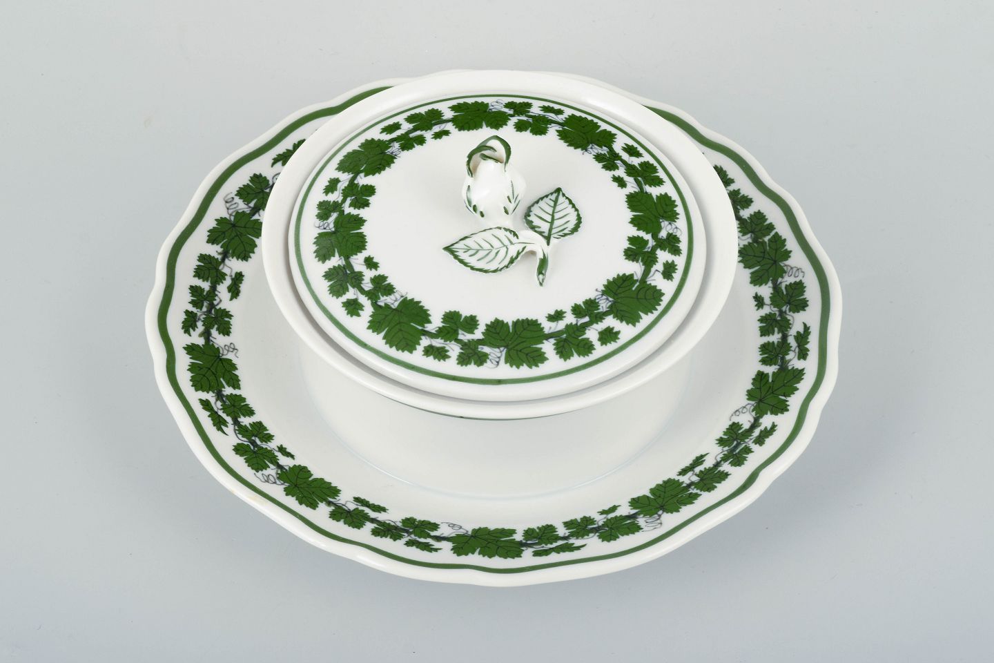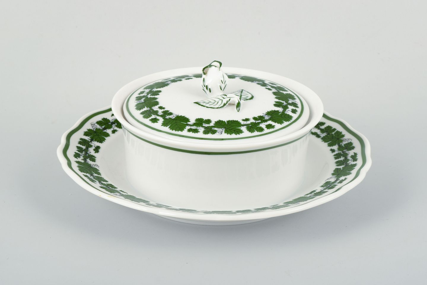 Porcelænsskål med låg fra Meissen, dekoreret i Vine-Leaf Pattern (“Voller grüner Weinkranz”). Skålen er udsmykket med grønne vinblade og ranker i underglasur, der følger formens klassiske linjer. Låget afsluttes med knop i form af et blad, som understøtter stellets naturinspirerede udtryk.