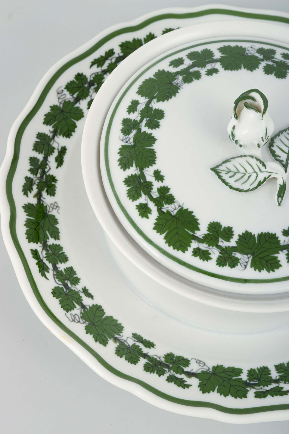 Meissen Porzellan, grundlagt i 1710, var Europas første porcelænsfabrik og blev hurtigt berømt for sit uovertrufne håndværk og kunstneriske innovation. Blandt fabrikkens ikoniske stel er Vine-Leaf Pattern, på tysk “Voller grüner Weinkranz”, introduceret omkring 1817 af Johann Samuel Arnhold. Dekorationen med grønne vinblade og slyngende ranker blev et af Meissens mest populære mønstre og har været produceret langt ind i det 20. århundrede og senere. Stellet repræsenterer Meissens fascination af naturens ornamentik og det præcise, håndmalede udtryk, som har gjort fabrikken til et symbol på europæisk porcelænstradition.