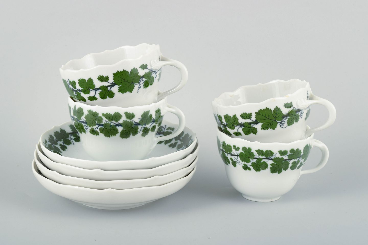 Fire par kopper og underkopper fra Meissen, dekoreret i det klassiske Vine-Leaf Pattern (“Voller grüner Weinkranz”) med grønne vinblade og slyngende ranker i underglasur. Et smukt eksempel på stellets elegante form og præcise håndmalede dekoration.