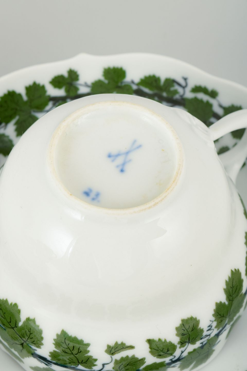 Blandt Meissens mest ikoniske stel er Vine-Leaf Pattern, på tysk “Voller grüner Weinkranz”, introduceret omkring 1817 af Johann Samuel Arnhold. Mønstret er dekoreret med grønne vinblade og slyngende ranker i underglasur, ofte kombineret med svungne former og elegante håndmalede detaljer.