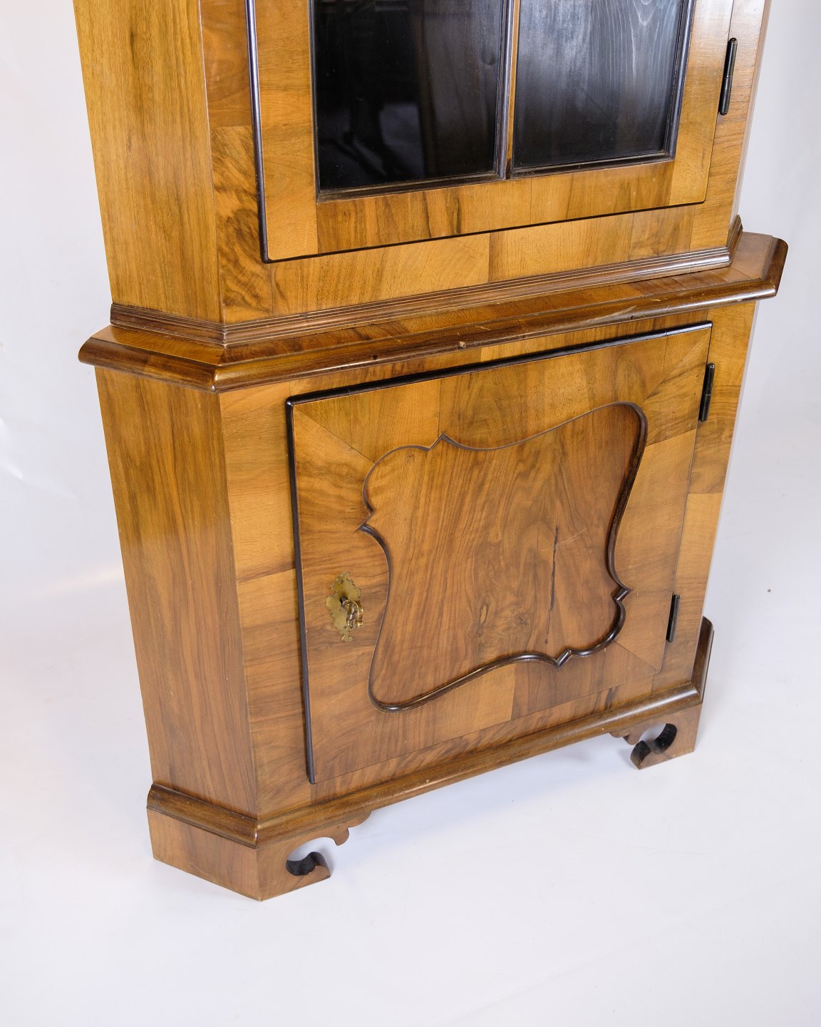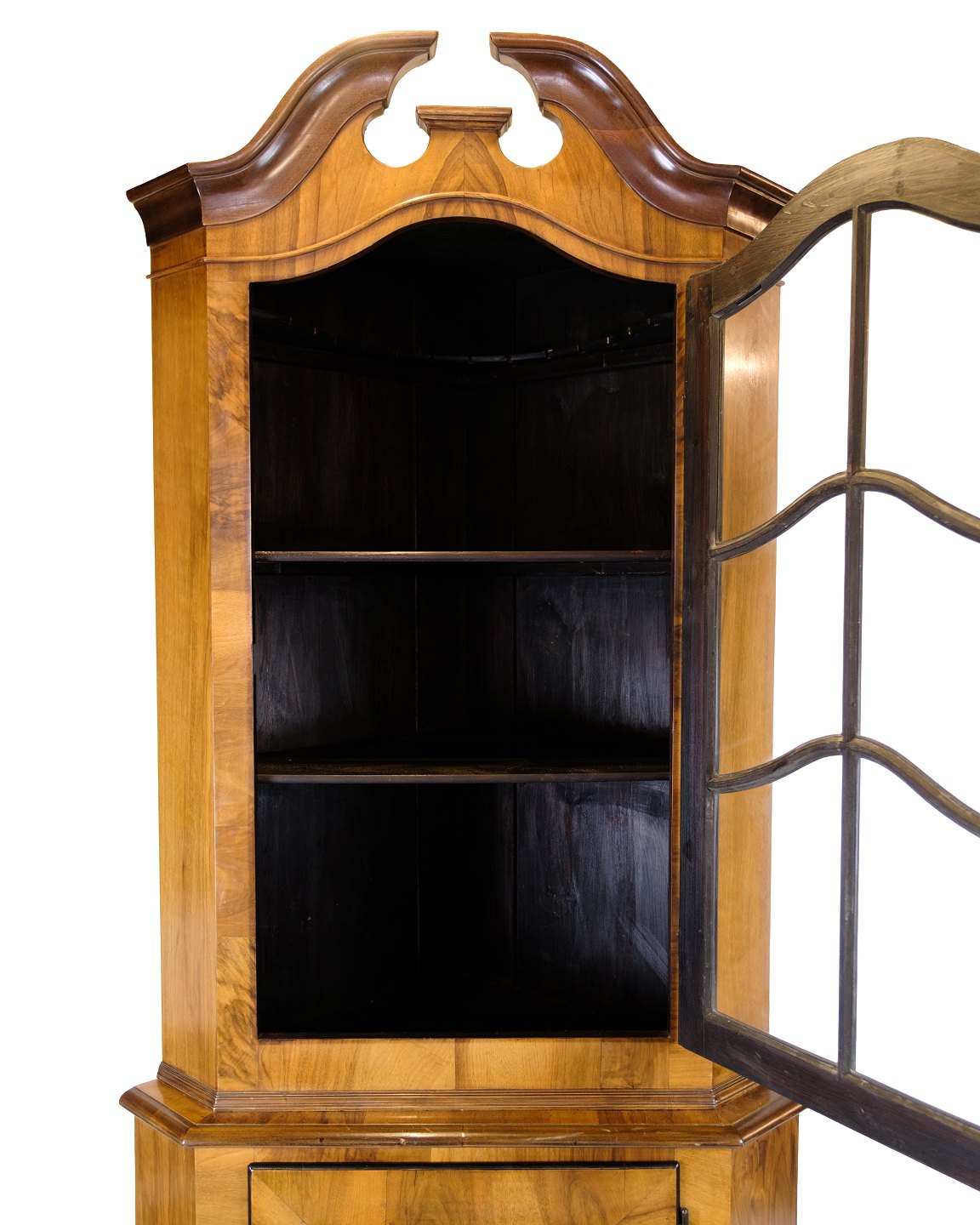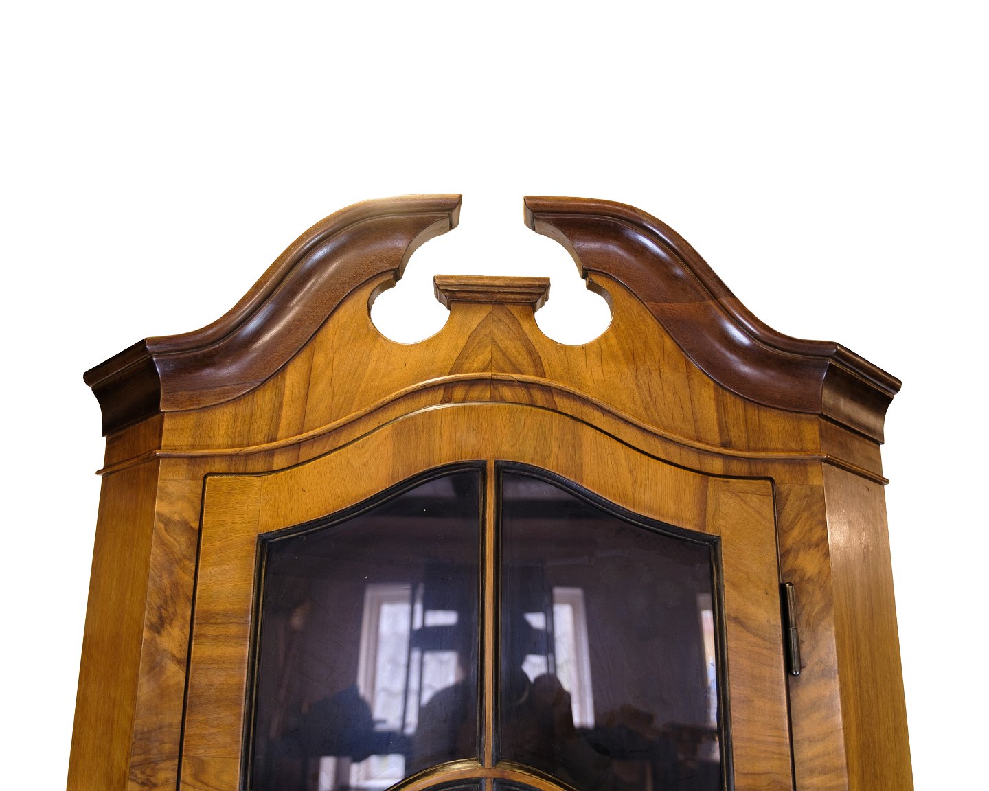 Antique display cabinet in baroque style from around 1900. Made of walnut with glass door and bars. Elegant corner cabinet with a classic look.