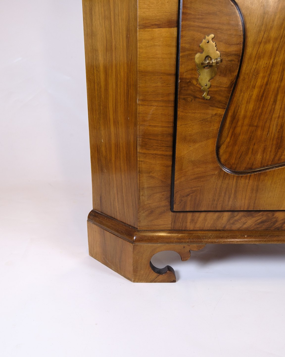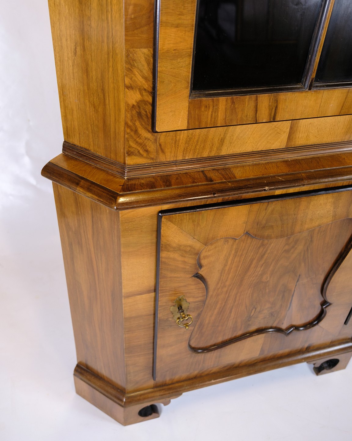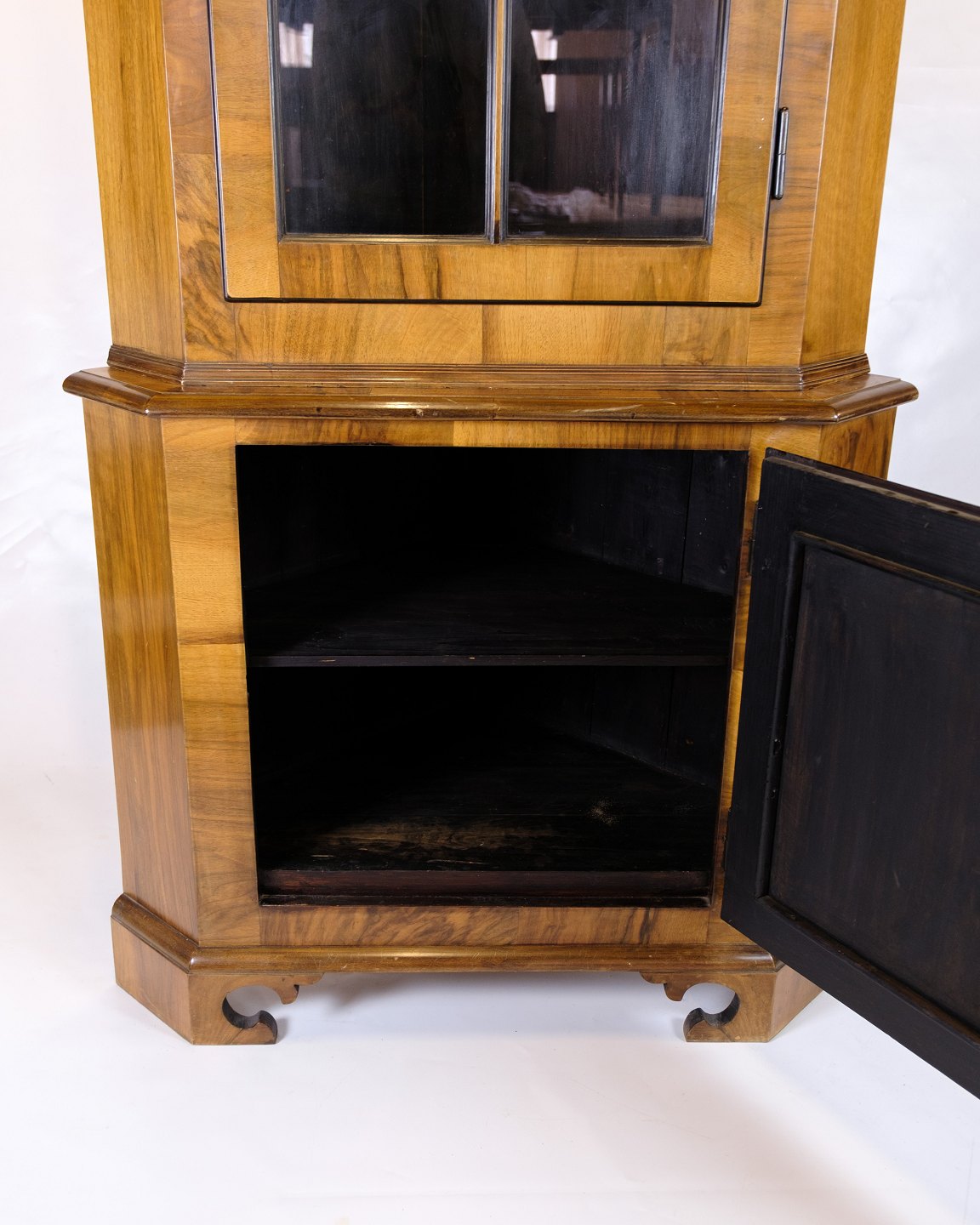 Antique display cabinet in baroque style from around 1900. Made of walnut with glass door and bars. Elegant corner cabinet with a classic look.