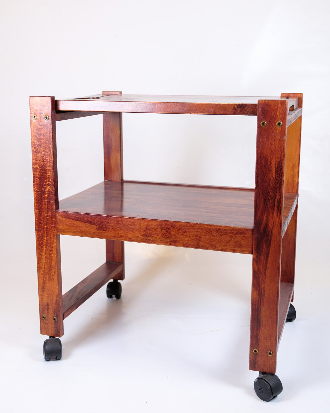 Text zugänglich auf Dänische: Vintage serveringsvogn på hjul, udført i mørkt træ. Vognen har et praktisk aftageligt skærebræt på toppen, som gør den funktionel både i køkkenet og ved servering.