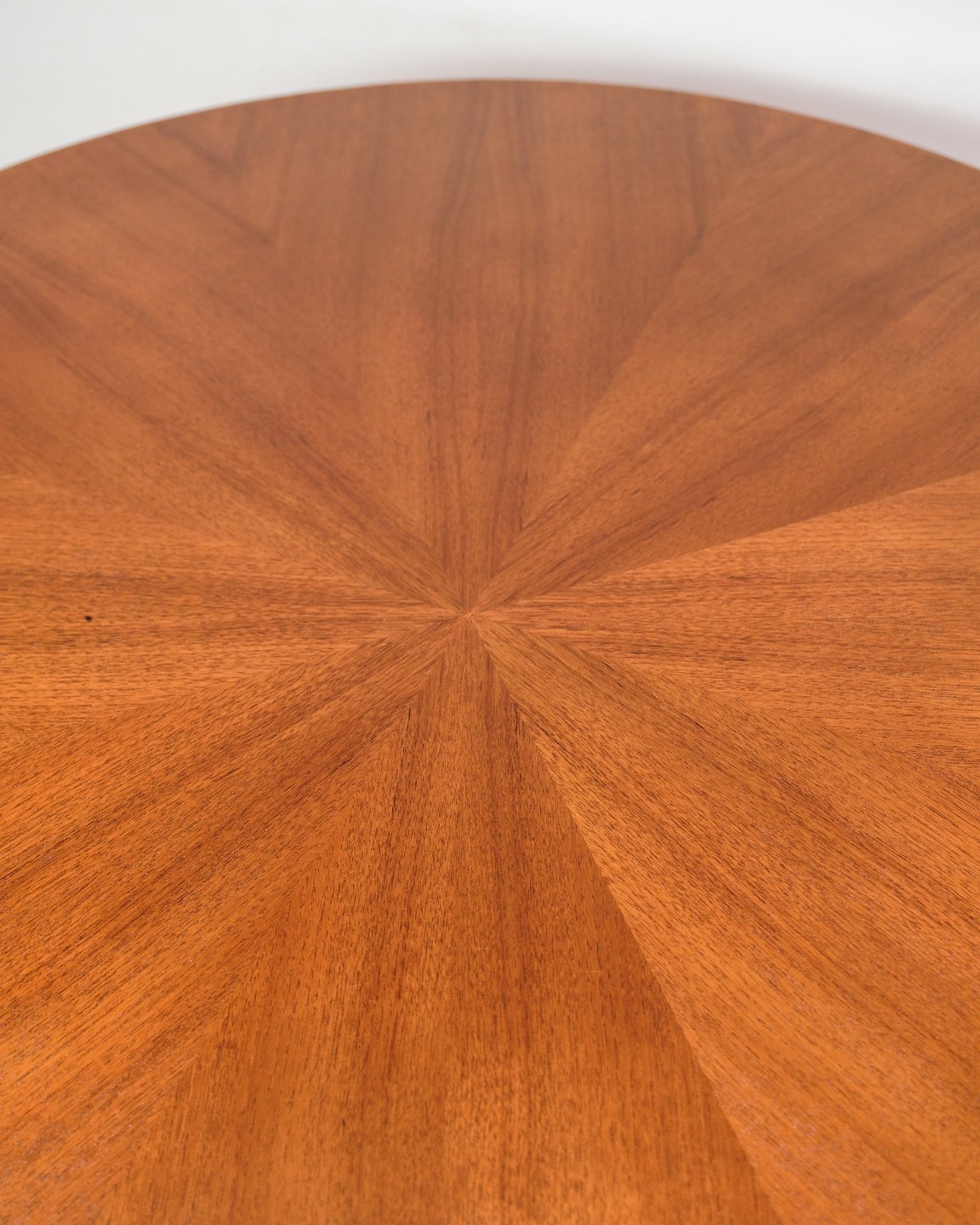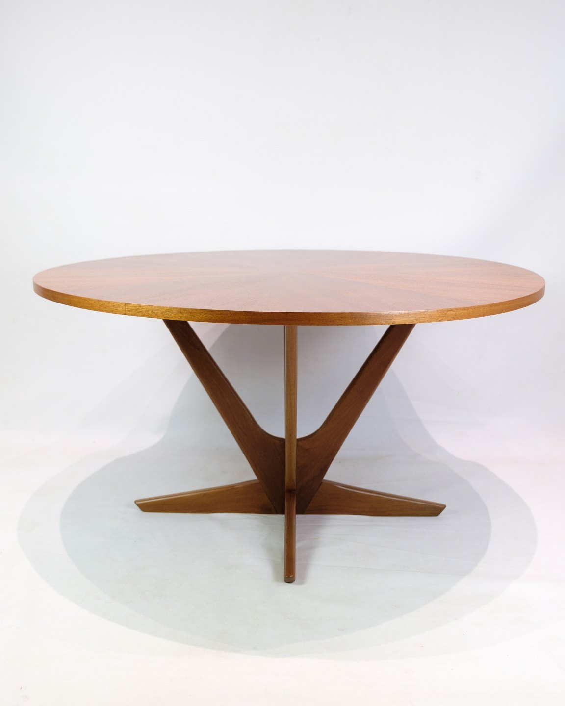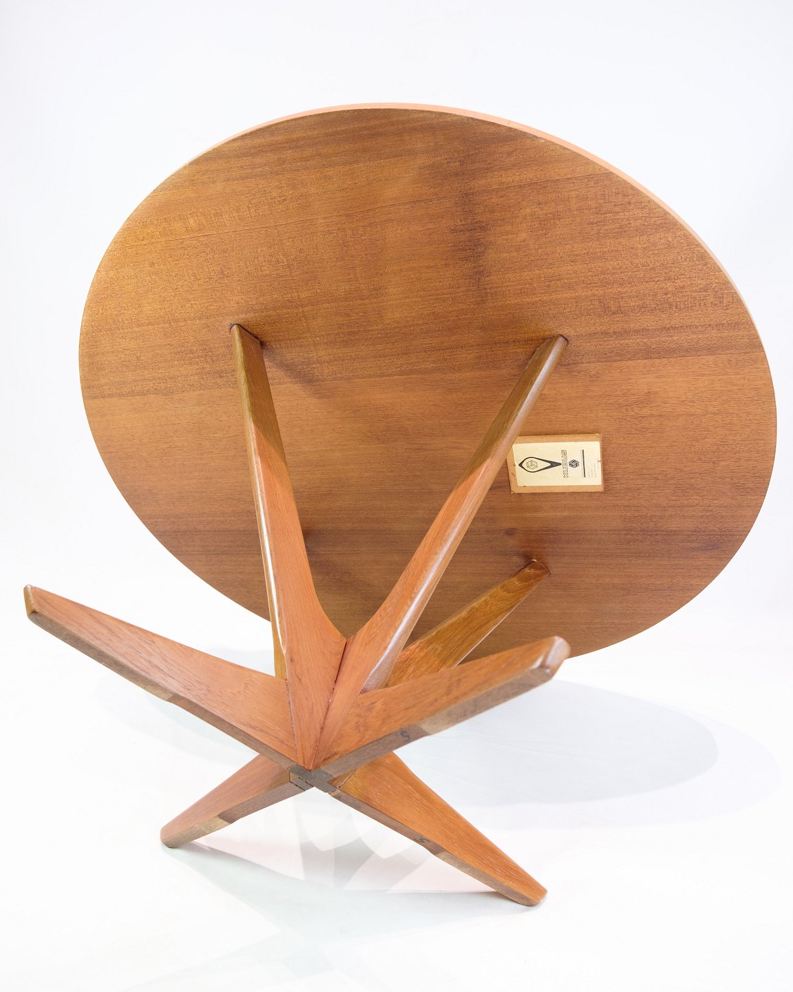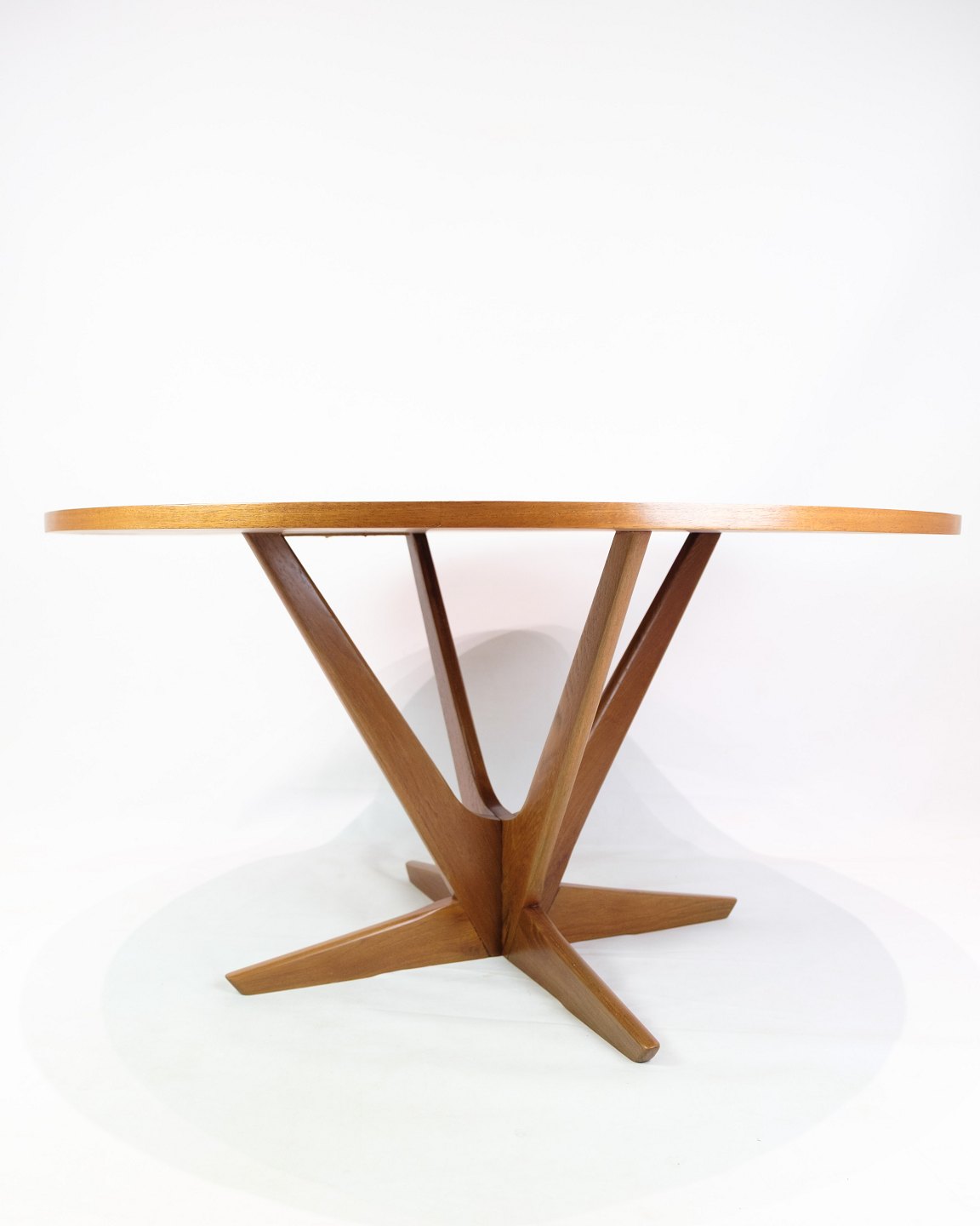 Text zugänglich auf Dänische: Rundt sofabord i teak, designet af Holger Georg Jensen og produceret af Kubus i 1960’erne. Bordpladen er udført i teakfinér med et smukt stjernemønstret åreforløb, der giver bordet et eksklusivt og levende udtryk. Understellet har et markant formsprog, der både understreger bordets skulpturelle karakter og giver en solid konstruktion.