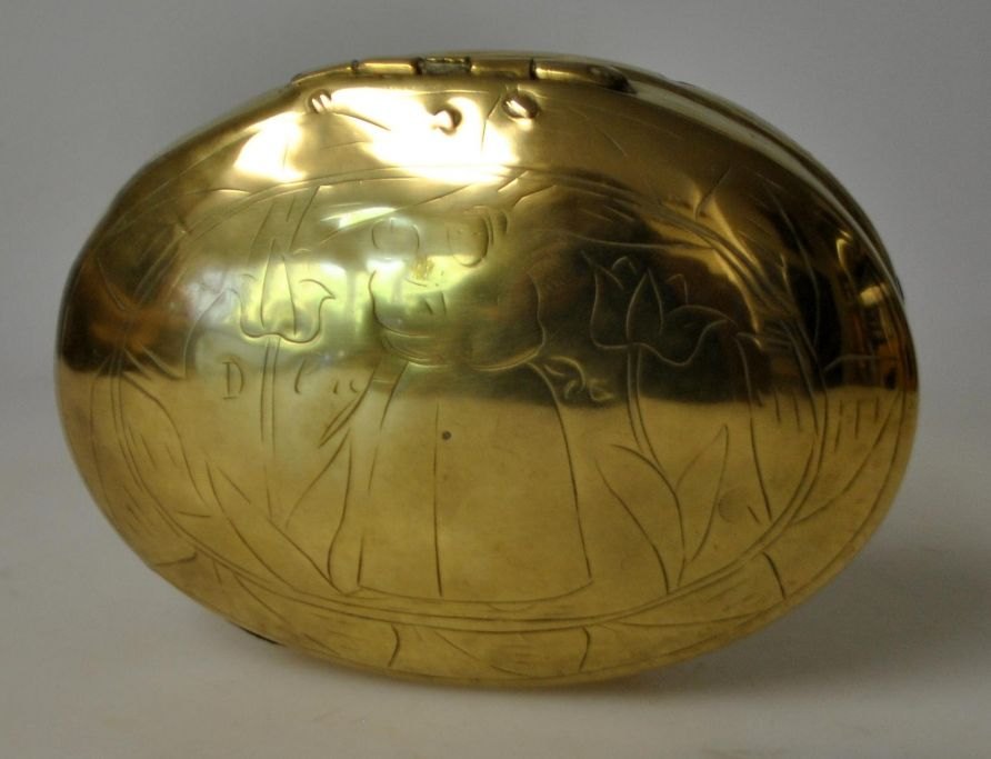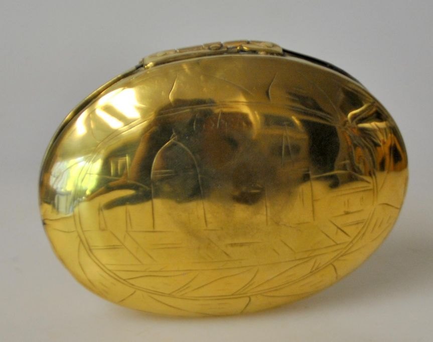Holländische Tabaksdose aus Messing mit Dekorationen in Form von zwei Frauen und Landschaft mit Kirche. Oval mit Deckel. Reparationen. Mit dem Eigentümer Initialen und Jahr signiert. 1749 L:. 11 cm.