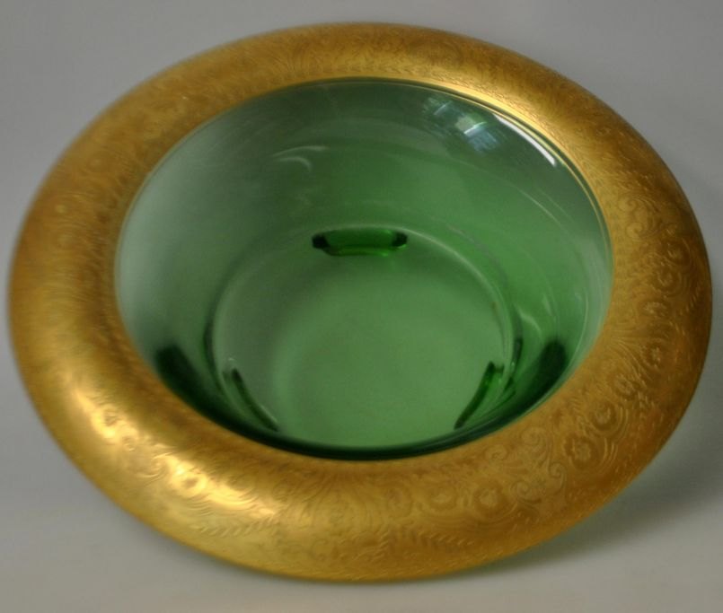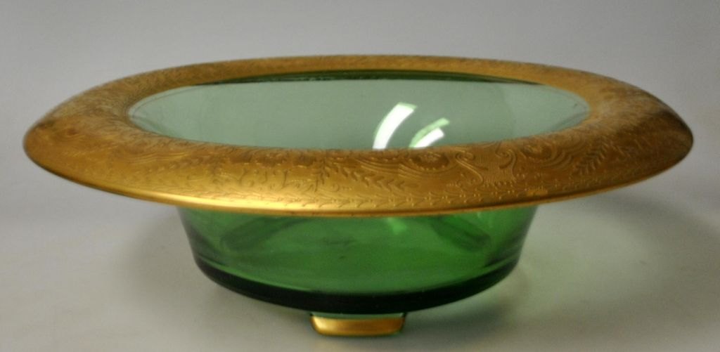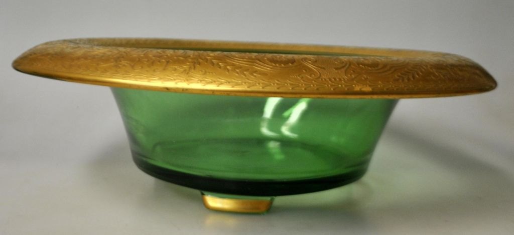 Art-déco-Tischschale, L. Moser & Söhne, Karlsbad, um 1920. Obstschale aus grünem Glas mit vergoldetem Rand. Randdekor in Form von Blumen. Vergoldung an den drei Beinen. H.: 9 cm. Durchmesser: 28 cm.