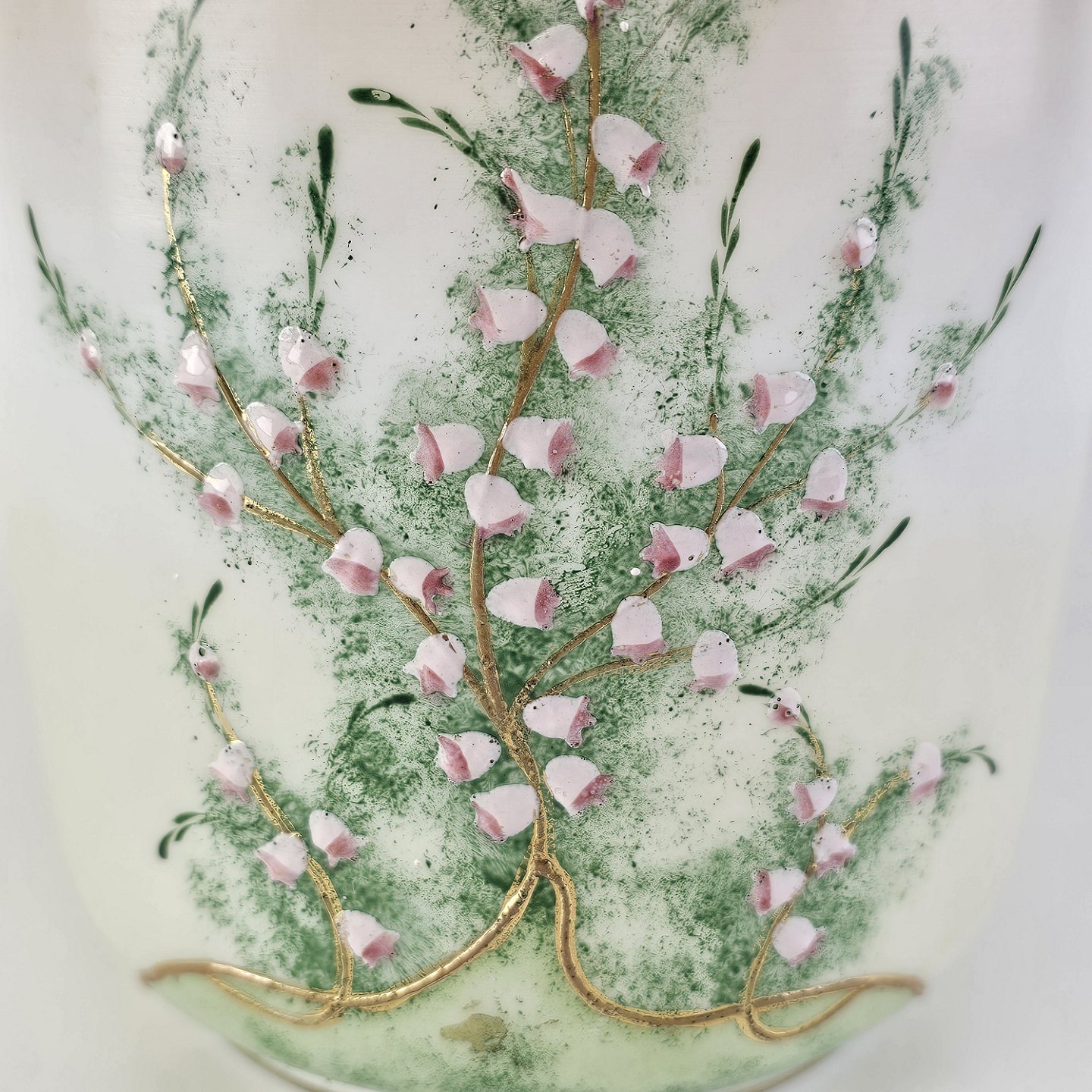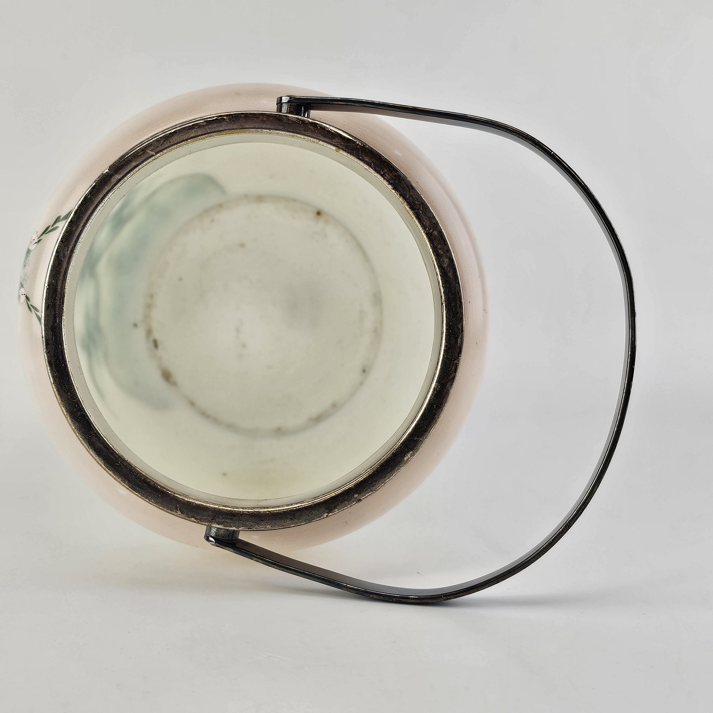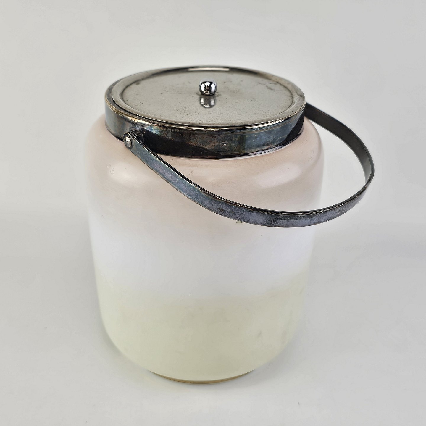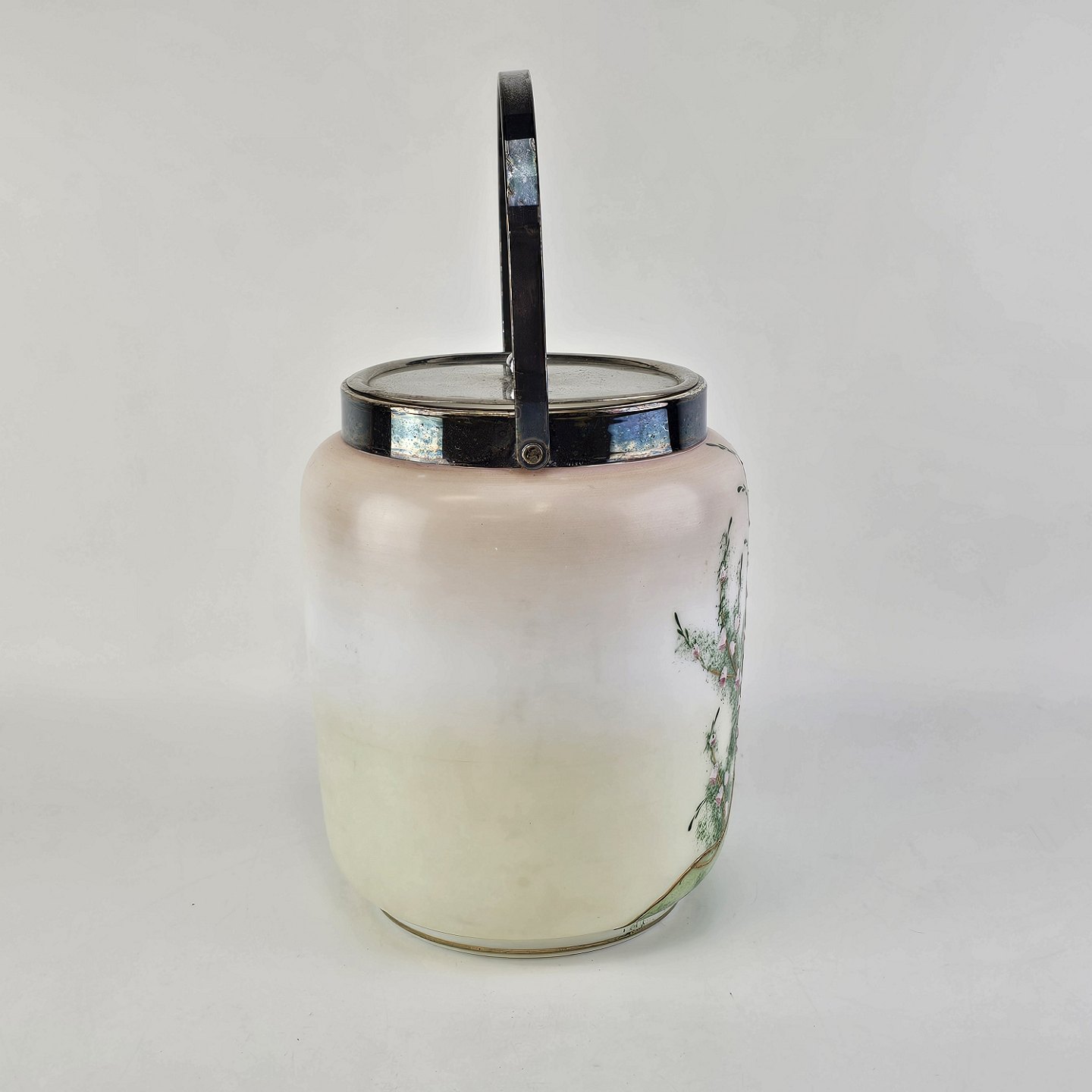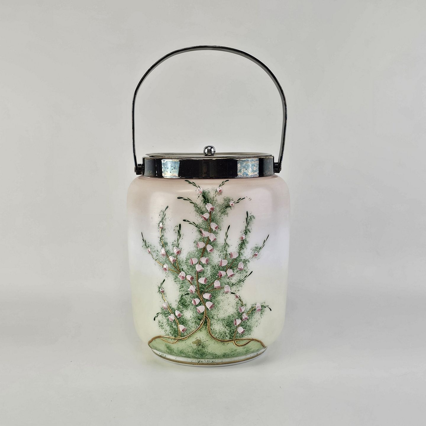 Håndmalet opalglas krukke med låg og håndtag, dekoreret med blomstermotiv. Låg og hank lavet af metal