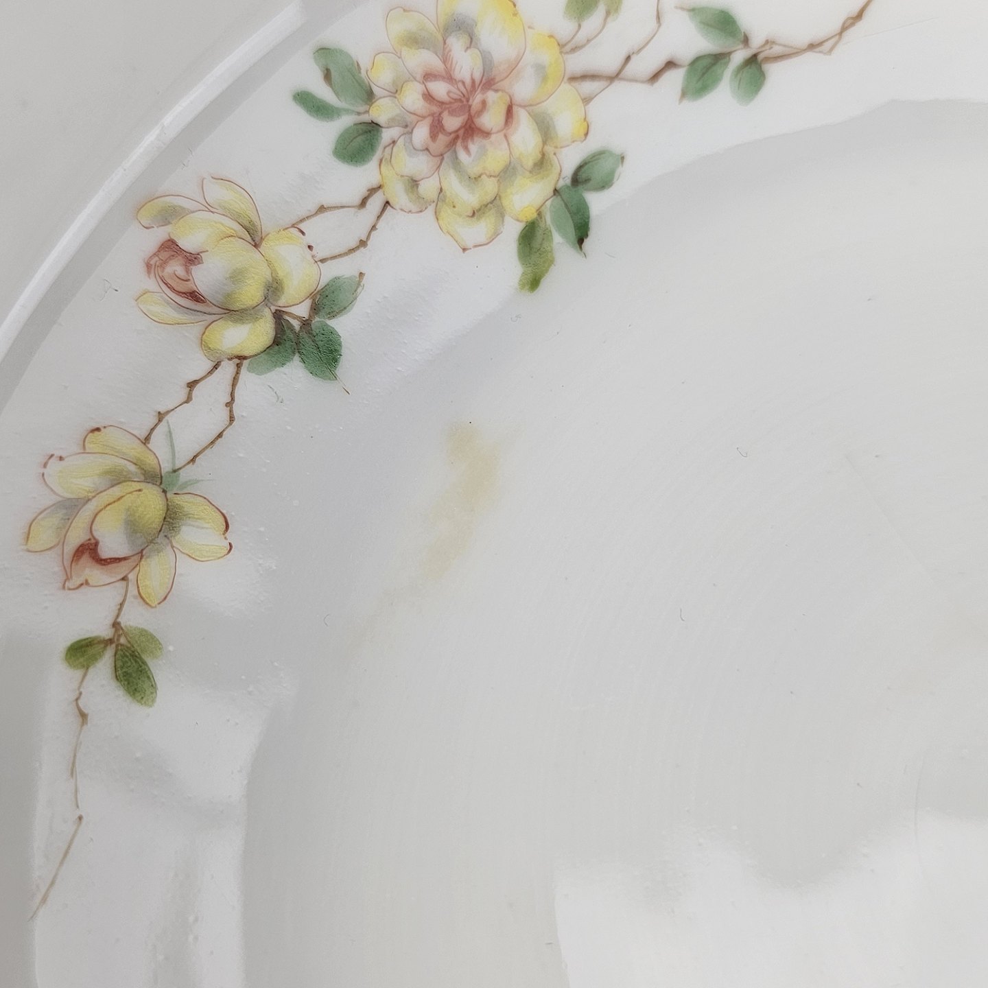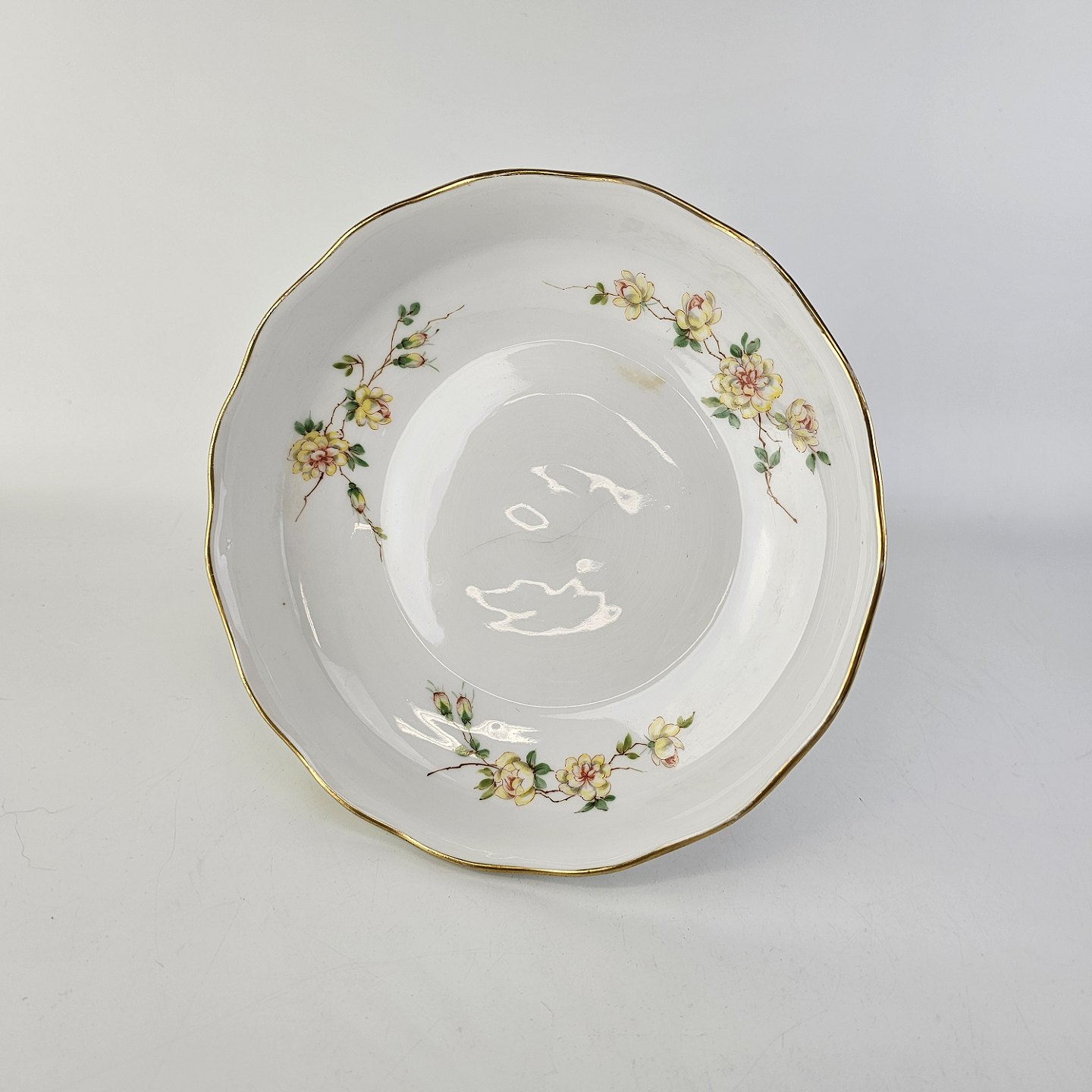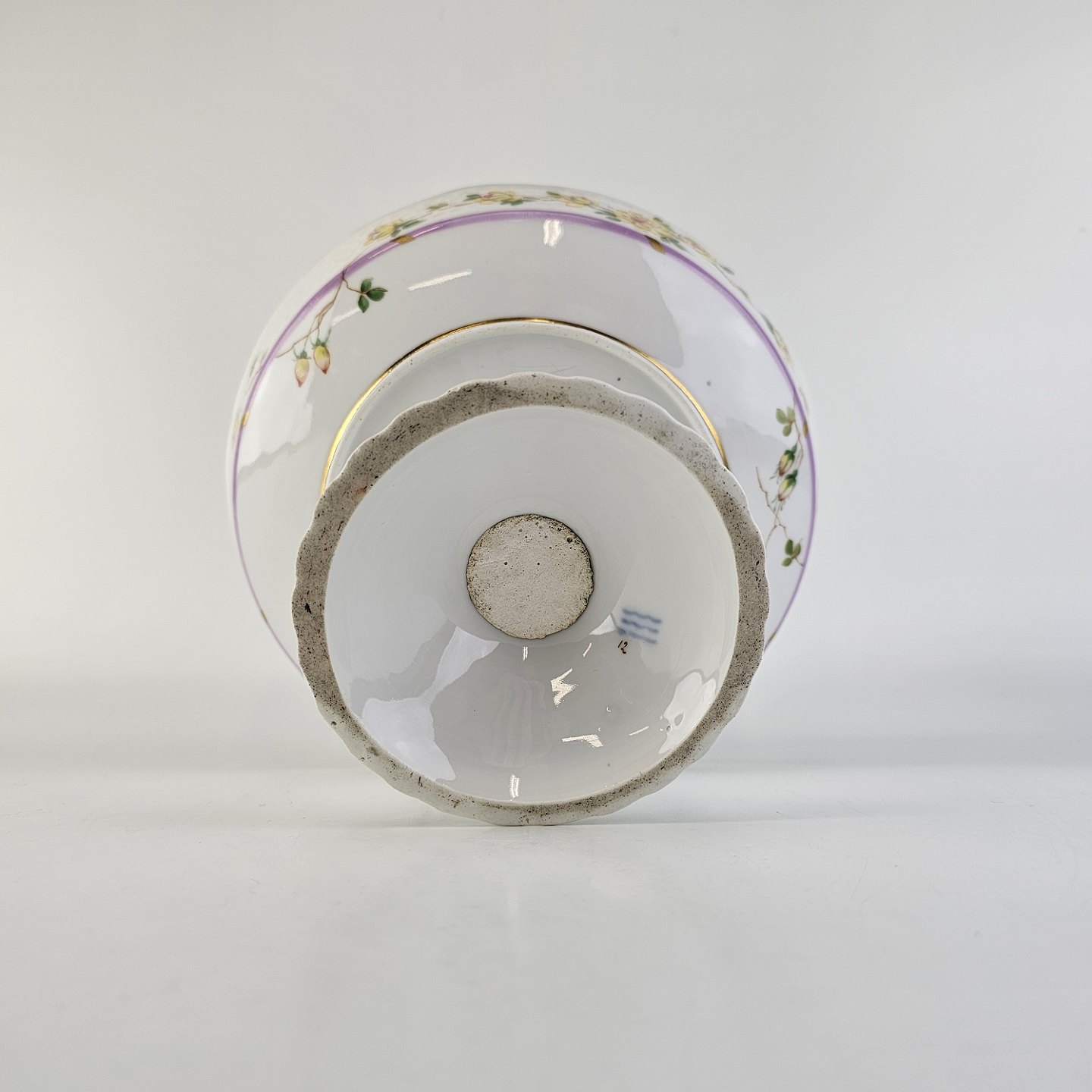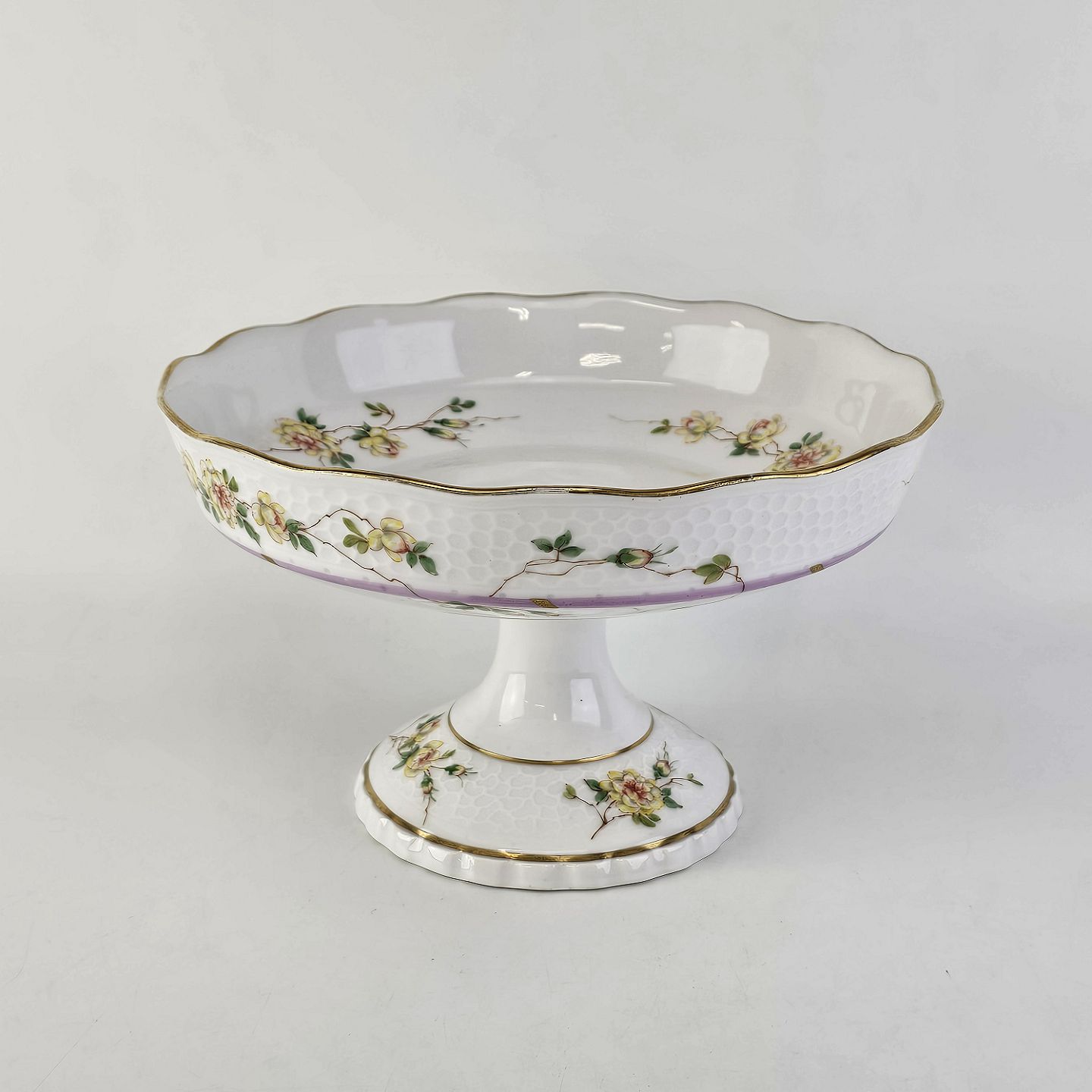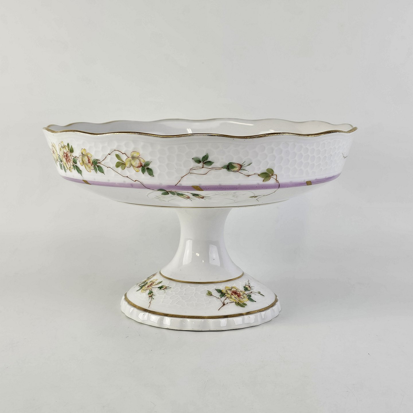 Service i hvidt porcelæn med hamret kantmønster dekoreret med gule blomsterranker og lyslilla streg. Stellet er med guldkant og det er mærket med bølger anvendt frem til 1890.