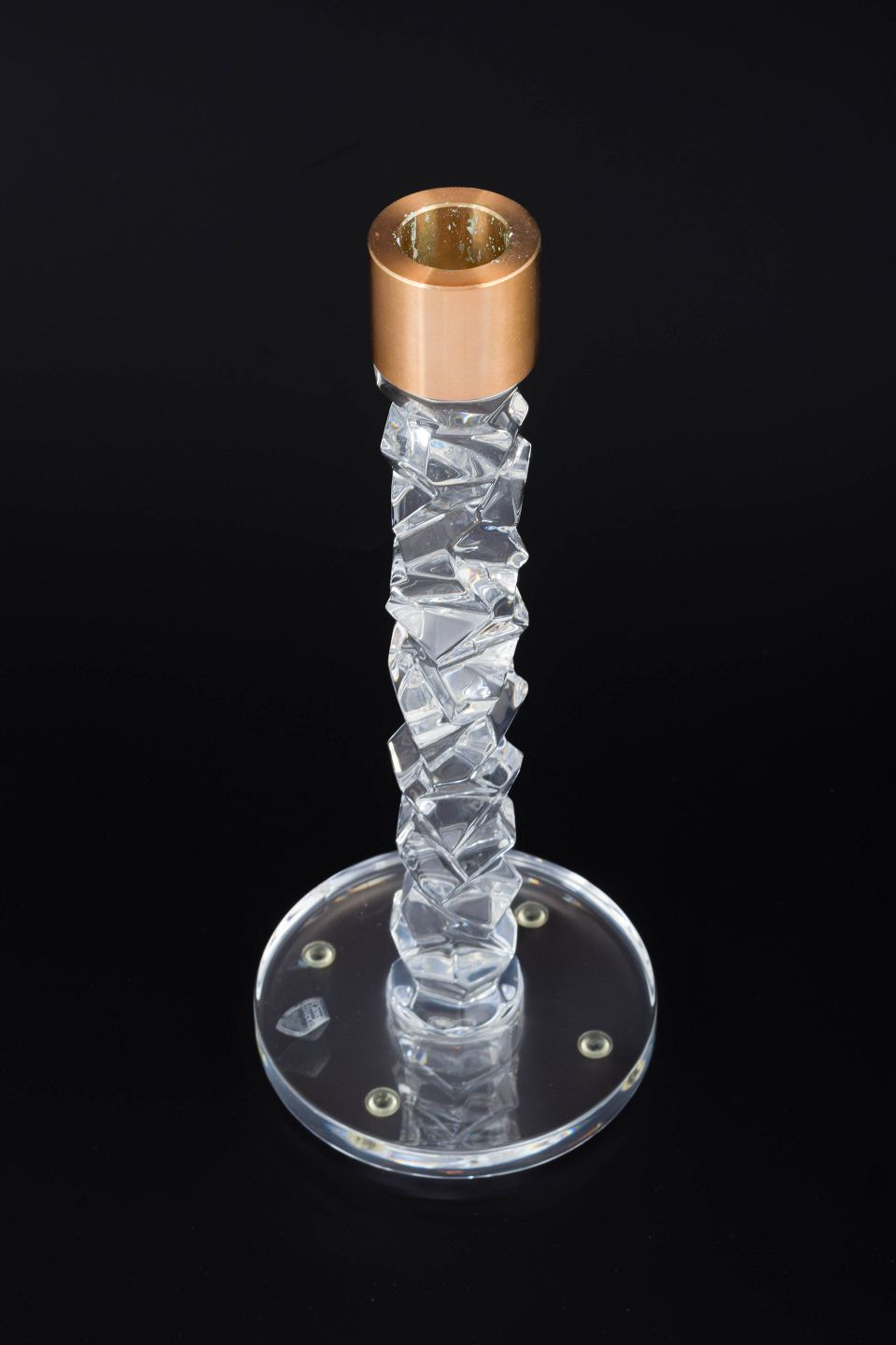 Krystalstage i presset og slebet glas med kobberindsats til lys. Stagens skaft er udformet i et skulpturelt, krystallinsk mønster, der reflekterer lyset smukt.
