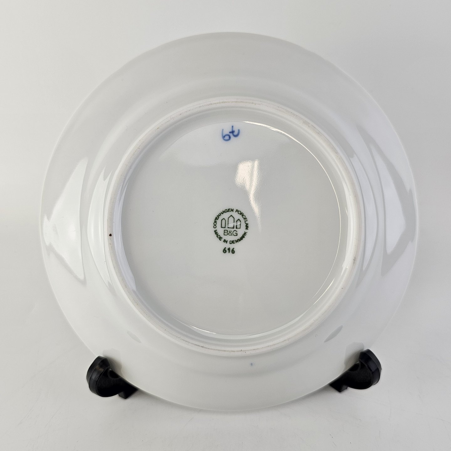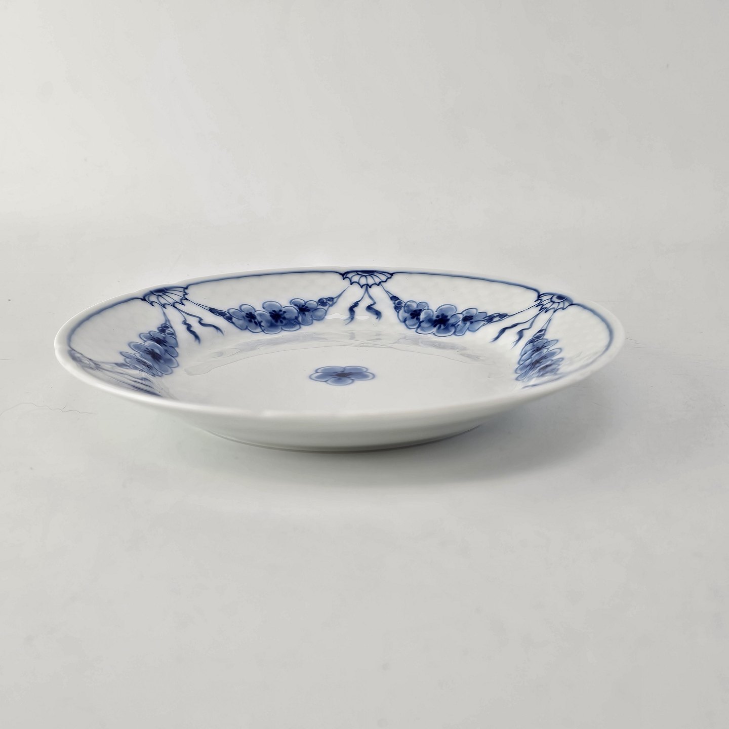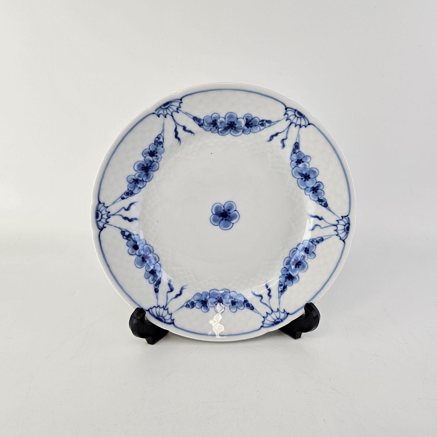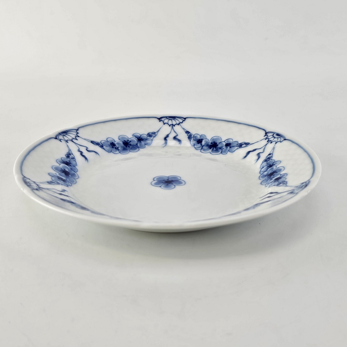 Service i hvidt porcelæn med skelform og motiv af guirlander med blå blomster
