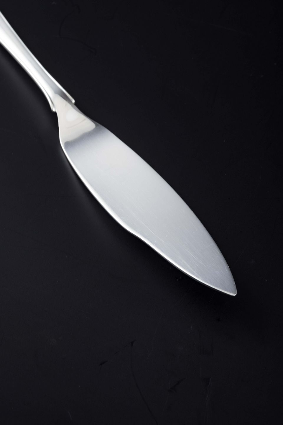 Fiskekniv i mønsteret "Liljekonval" (Lily of the Valley). Blankpoleret sterling sølv, elegant skaftafslutning med diskret blomster- og bladmotiv.