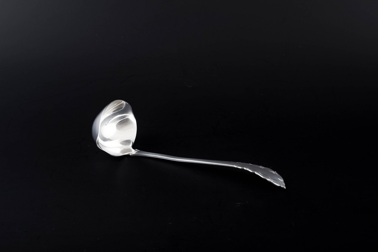 Sauceske i mønsteret "Liljekonval" (Lily of the Valley). Blankpoleret sterling sølv, elegant skaftafslutning med diskret blomster- og bladmotiv.