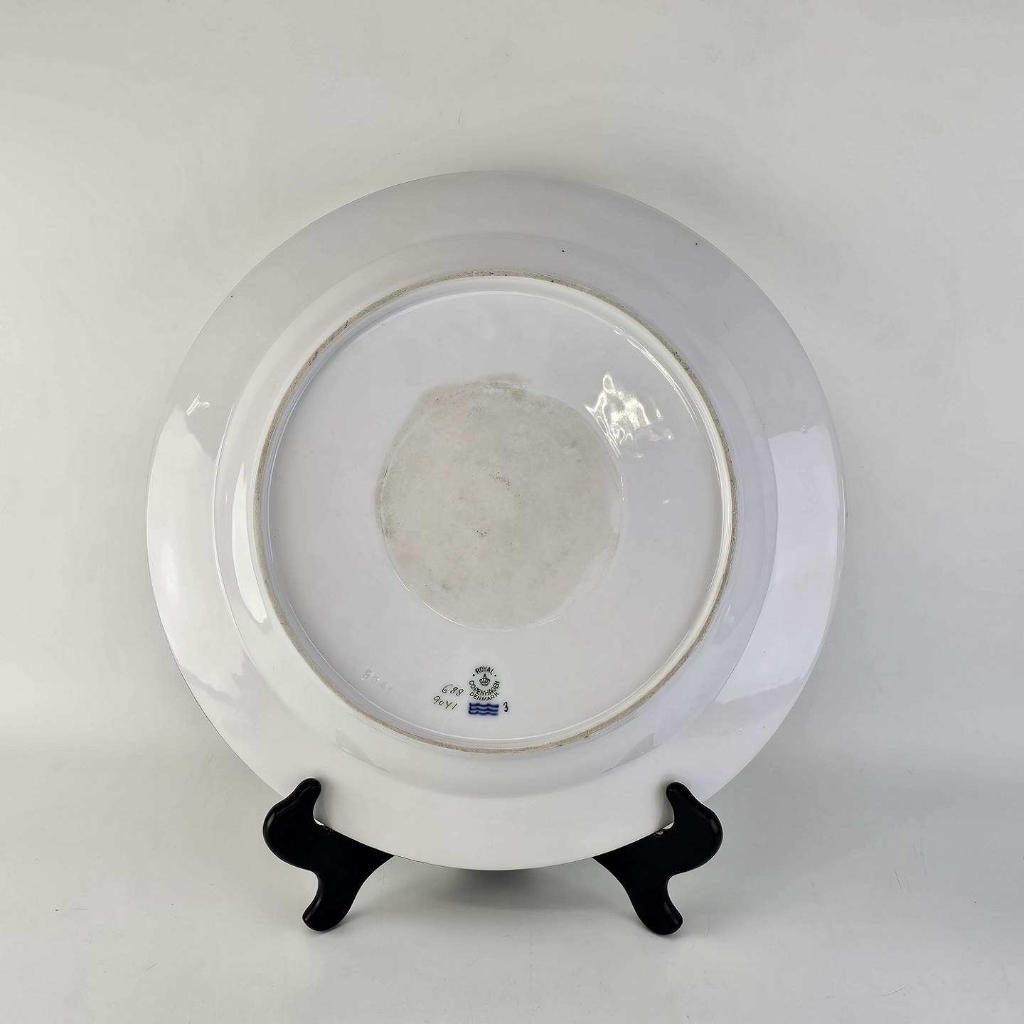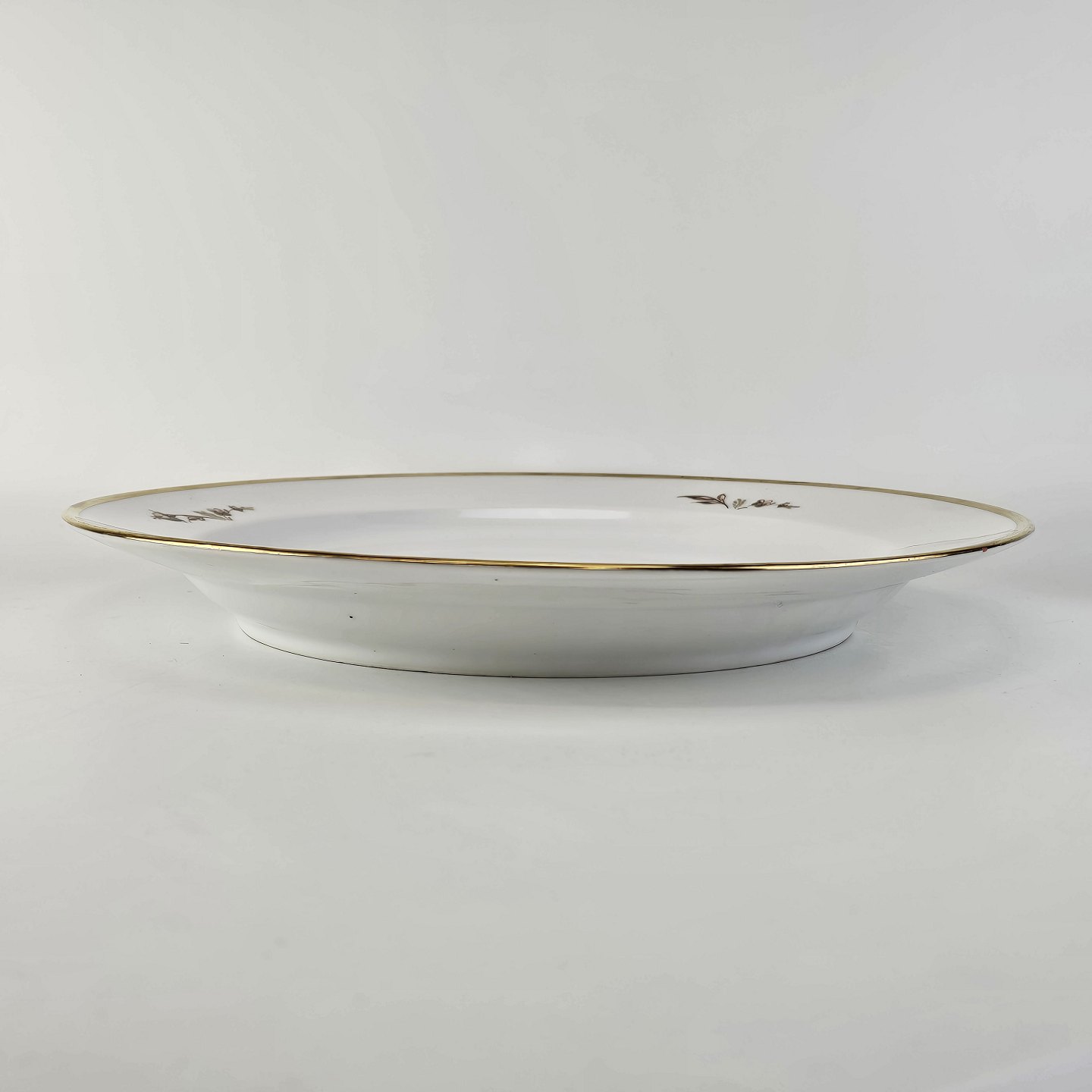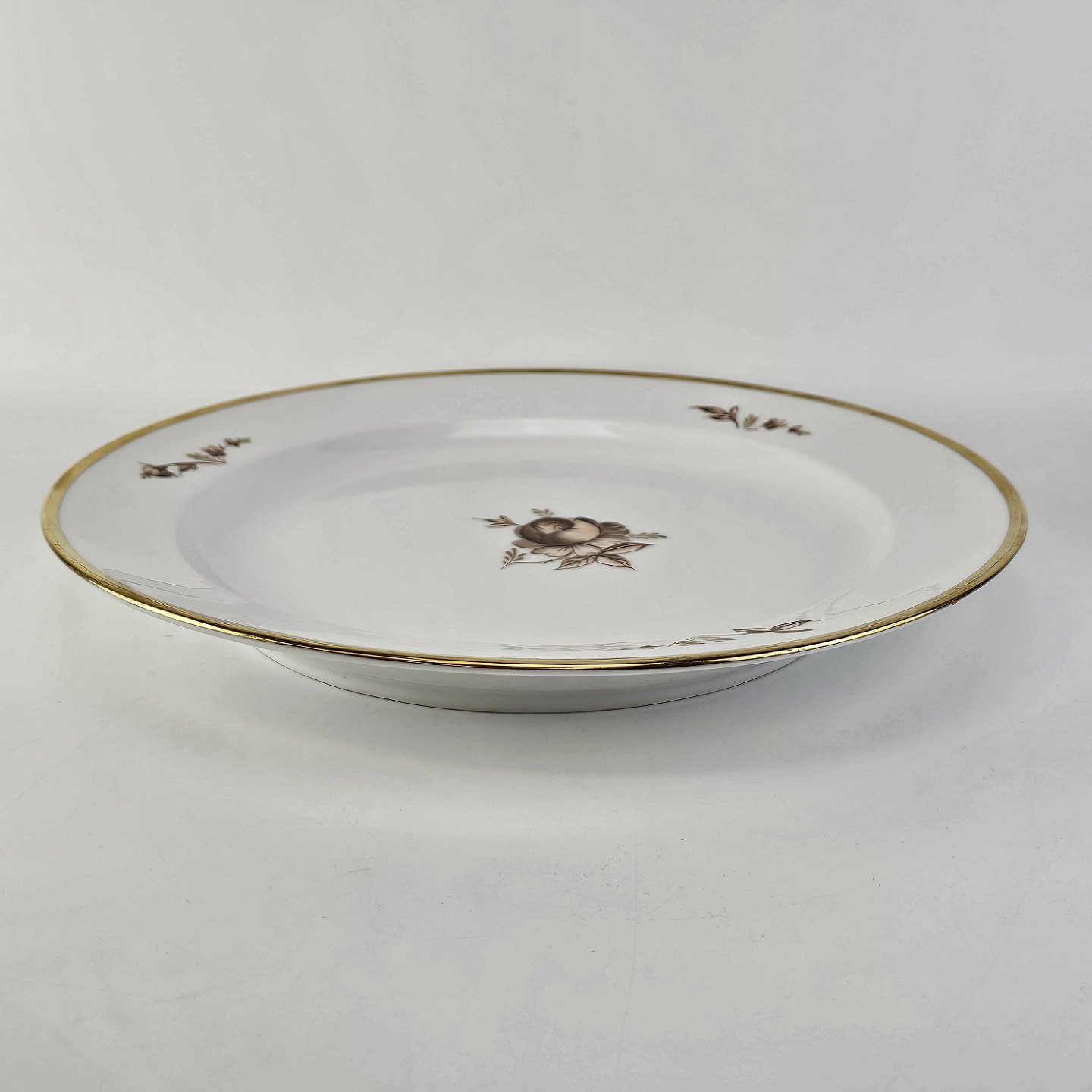 Stel i glat hvidt porcelæn dekoreret med brune roser og guldbort