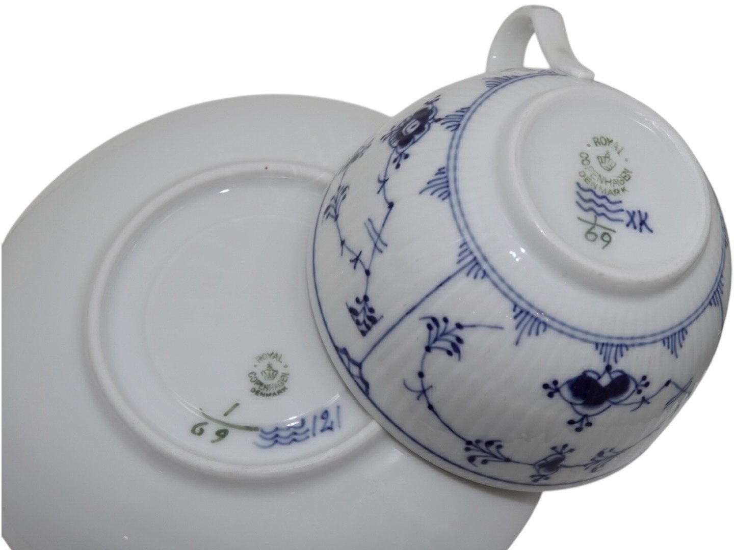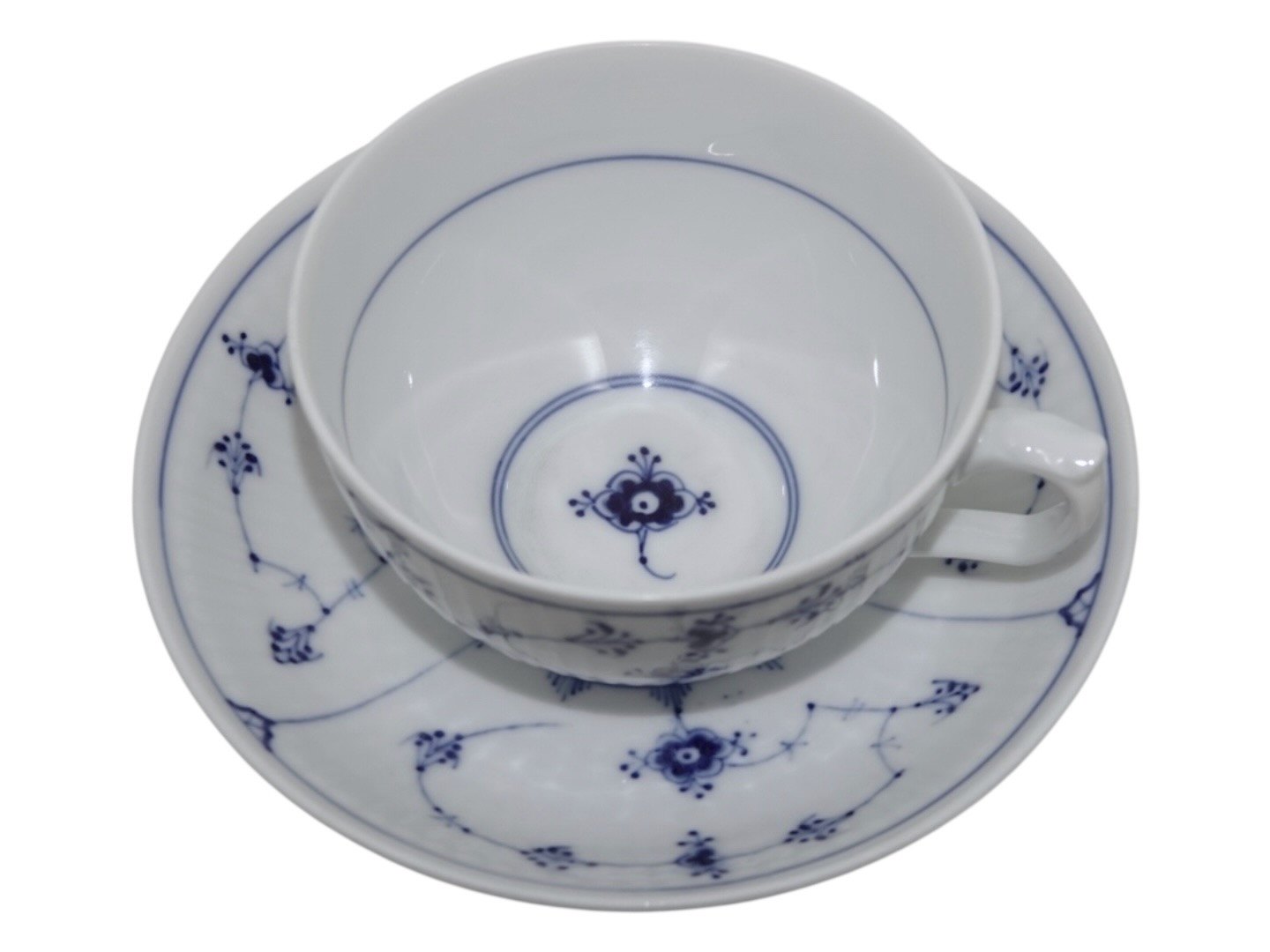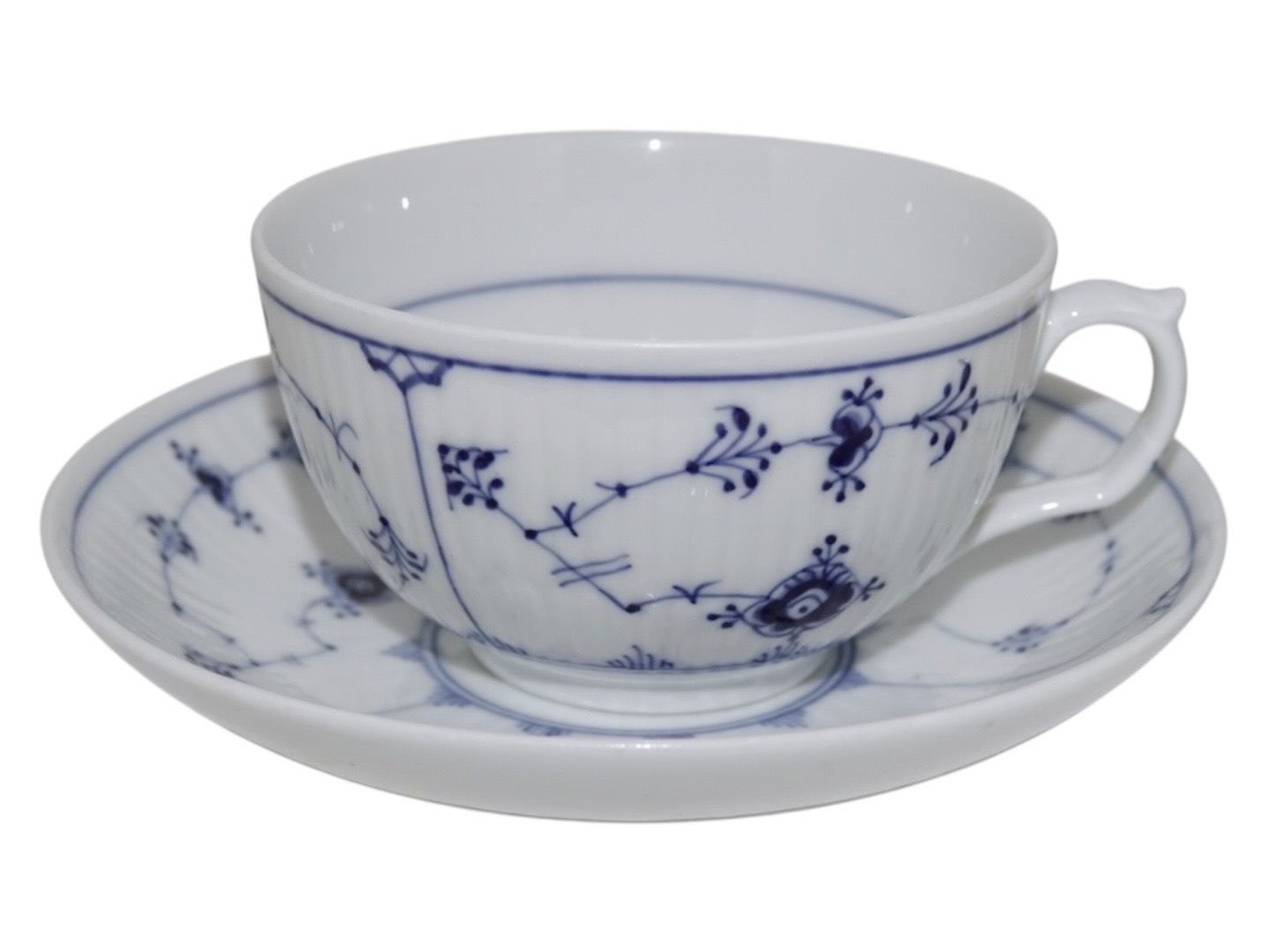 Text zugänglich auf Dänische: Royal Copenhagen Musselmalet Riflet, sjælden set kæmpe tekop med tilhørende underkop. (Kaldet en morgenkop).