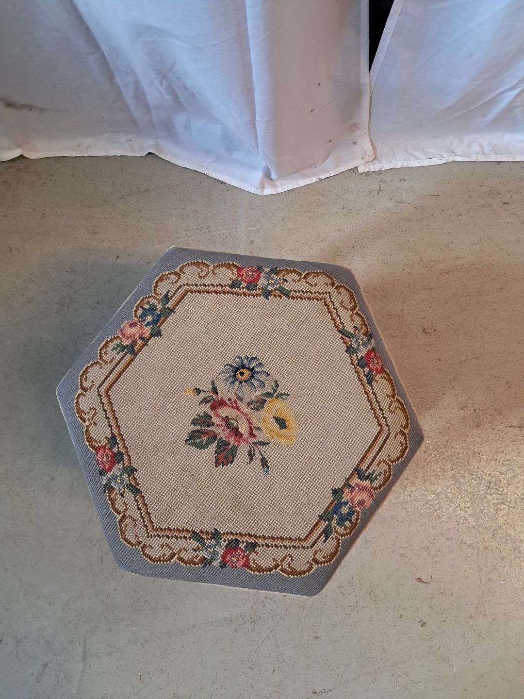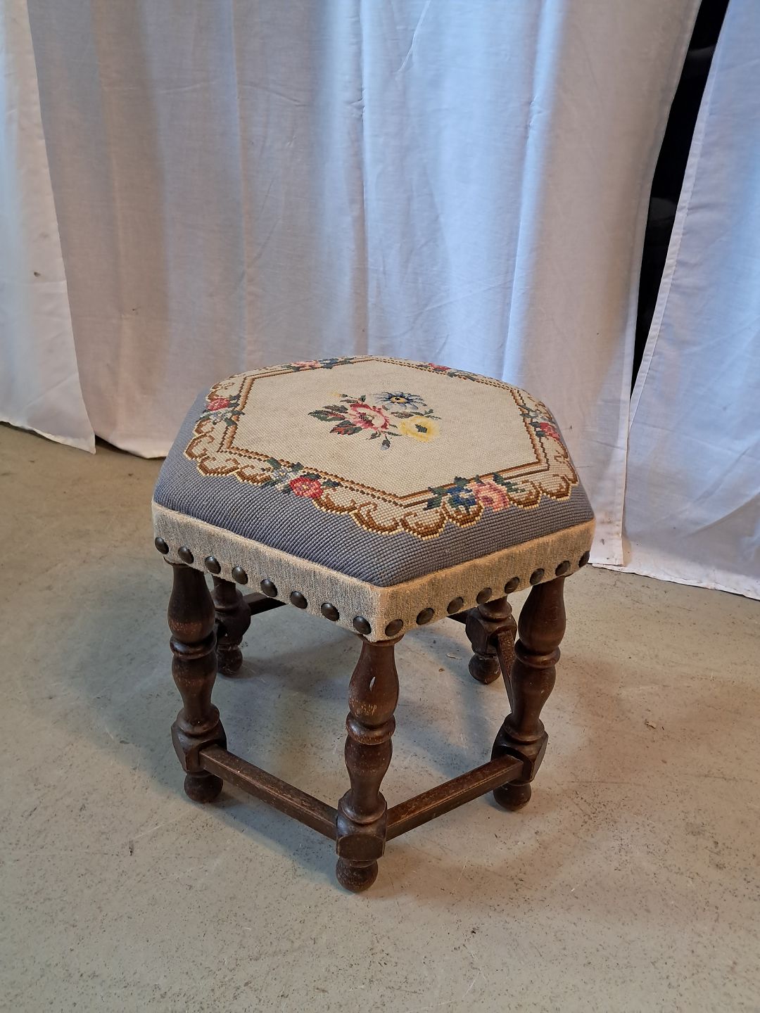 Skammel i bøgetræ med broderet betræk, fra 1950erne.