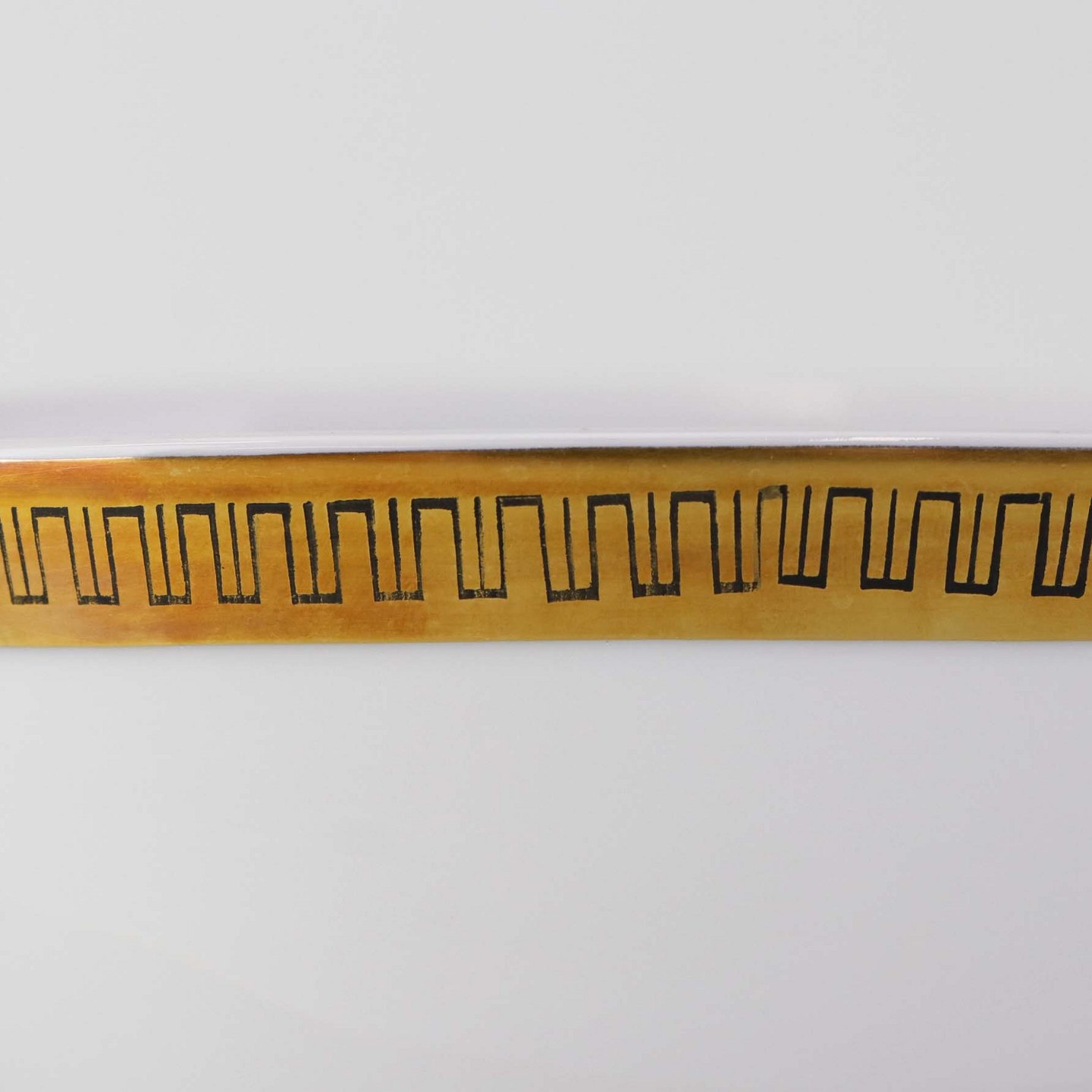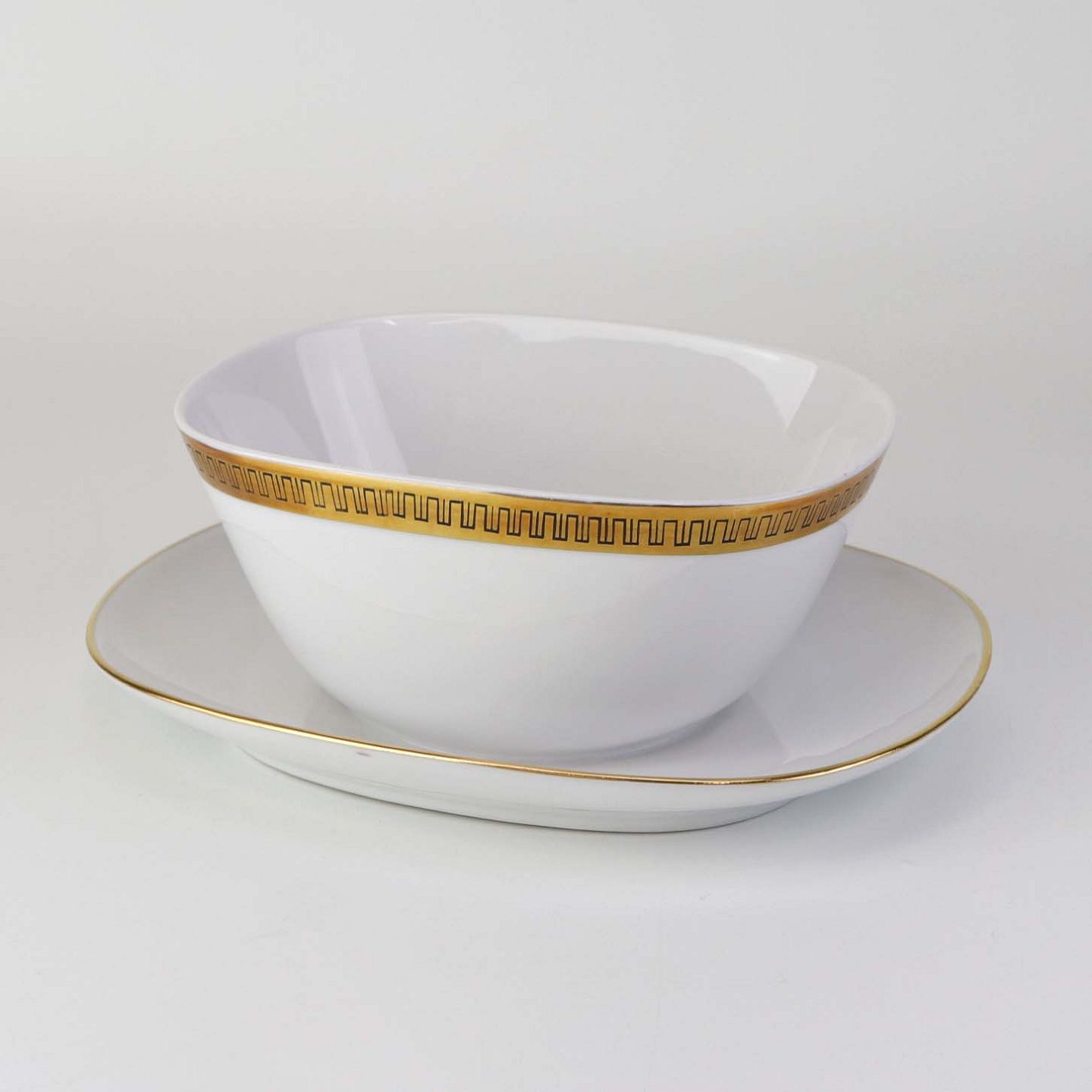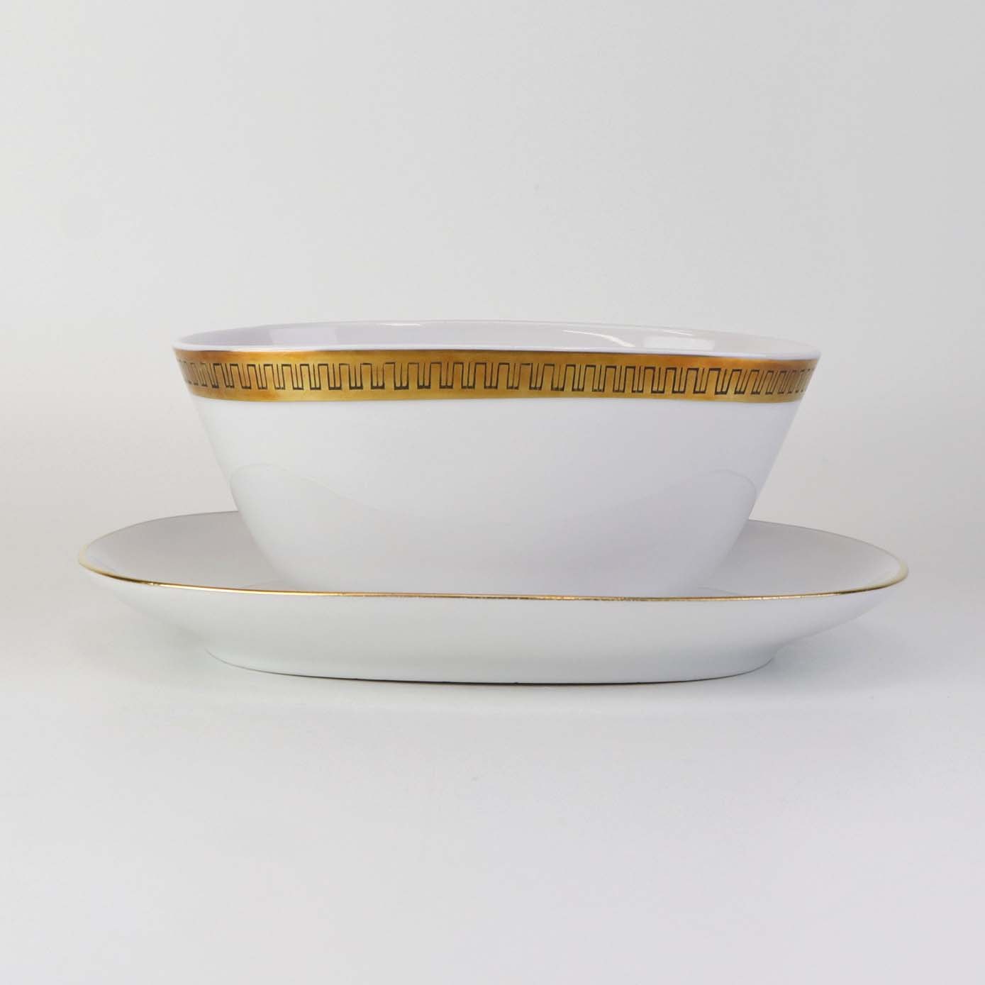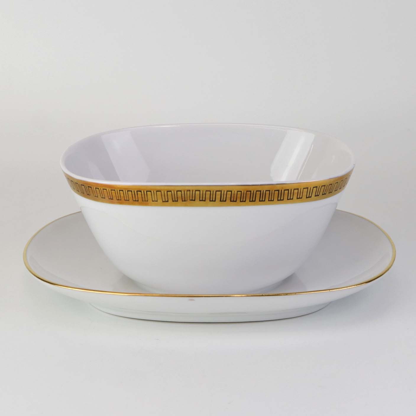 Stel i glat hvidt porcelæn dekoreret med sort streg i guldbort.