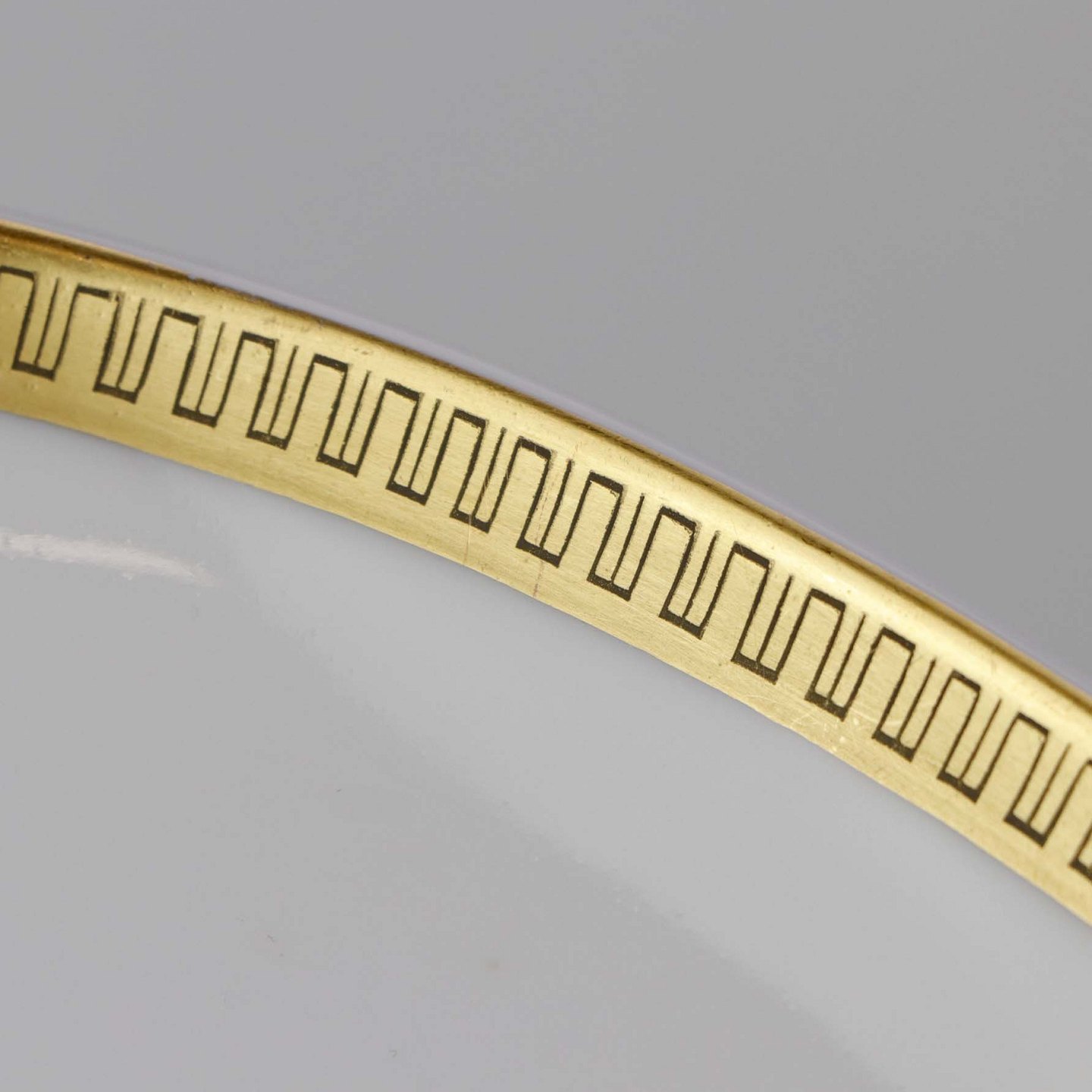 Fremstår med lettere brugsspor på guldbort, mindre slidtage på indersiden samt mindre mørkning under glasuren på bagsiden.