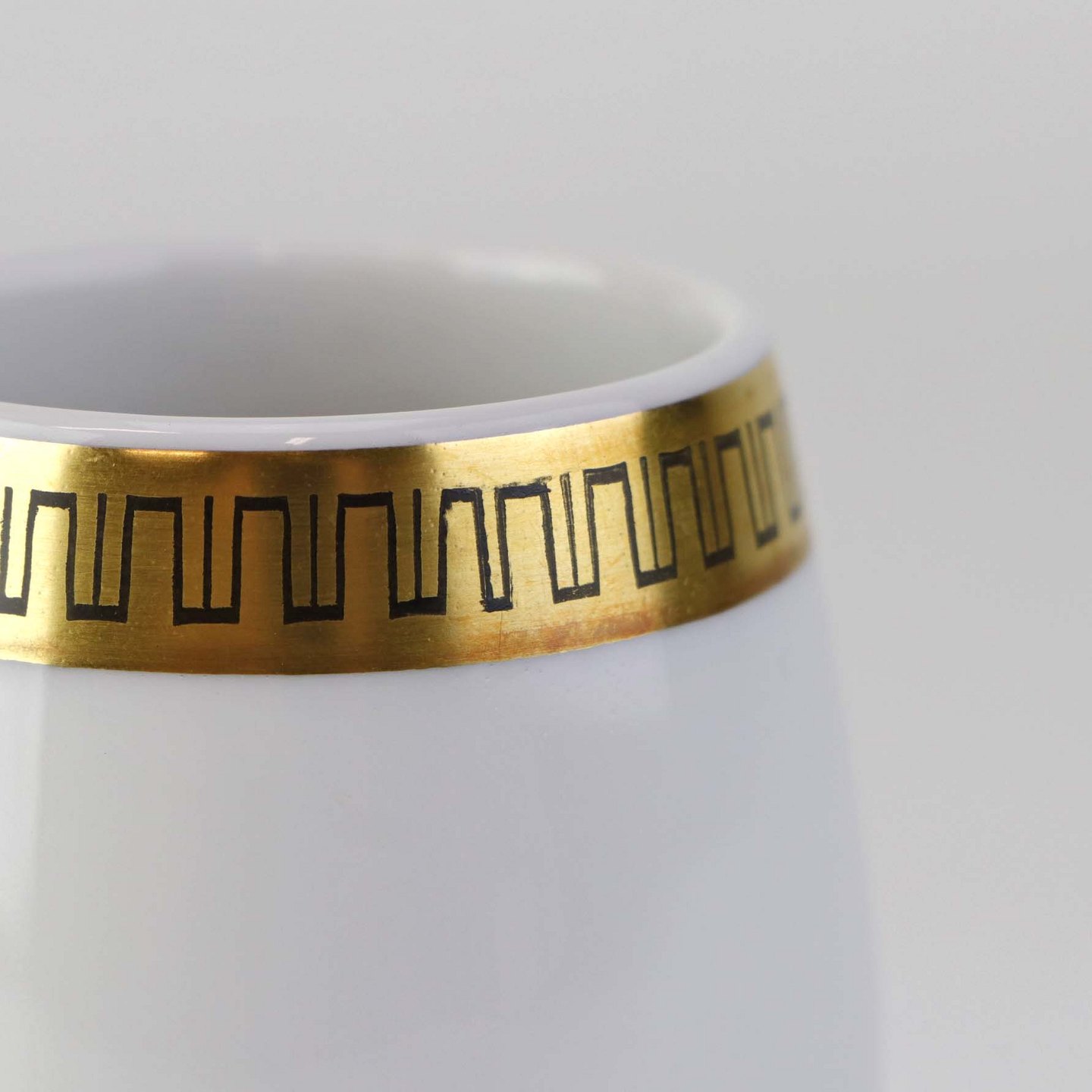 Stel i glat hvidt porcelæn dekoreret med sort streg i guldbort.
