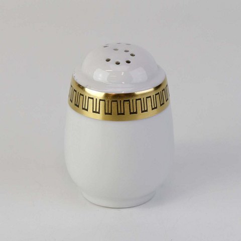 Stel i glat hvidt porcelæn dekoreret med sort streg i guldbort.