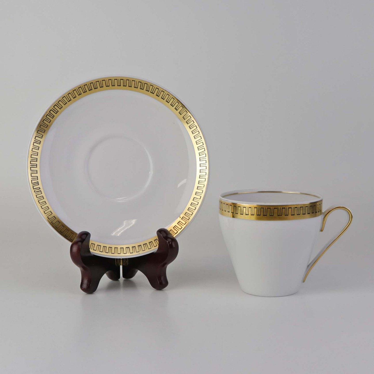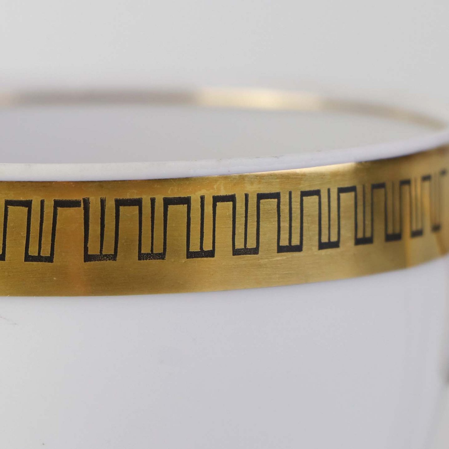 Stel i glat hvidt porcelæn dekoreret med sort streg i guldbort.