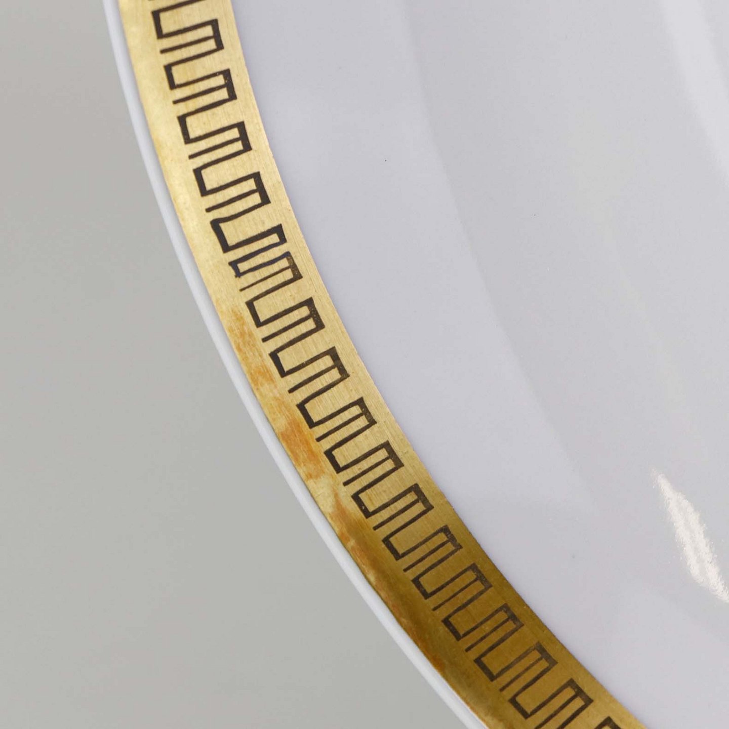 Stel i glat hvidt porcelæn dekoreret med sort streg i guldbort.
