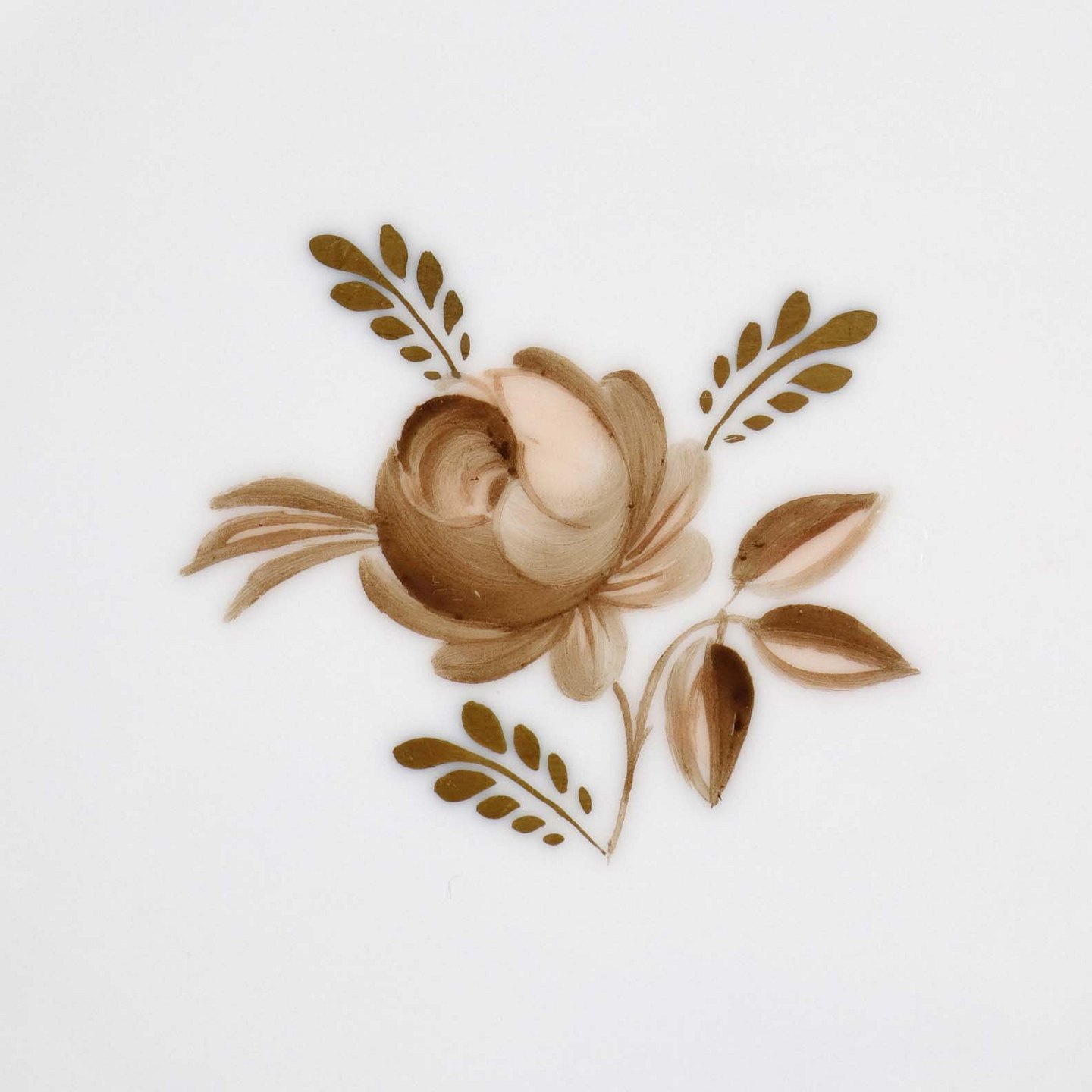 Stel i glat hvidt porcelæn dekoreret brune roser og kantet af med guldbort.