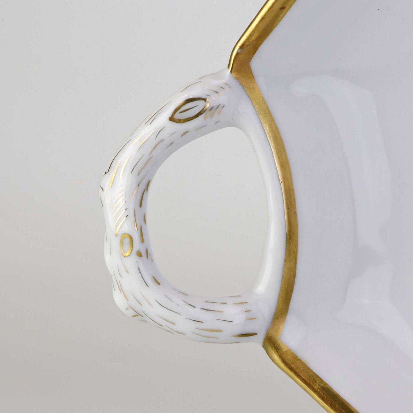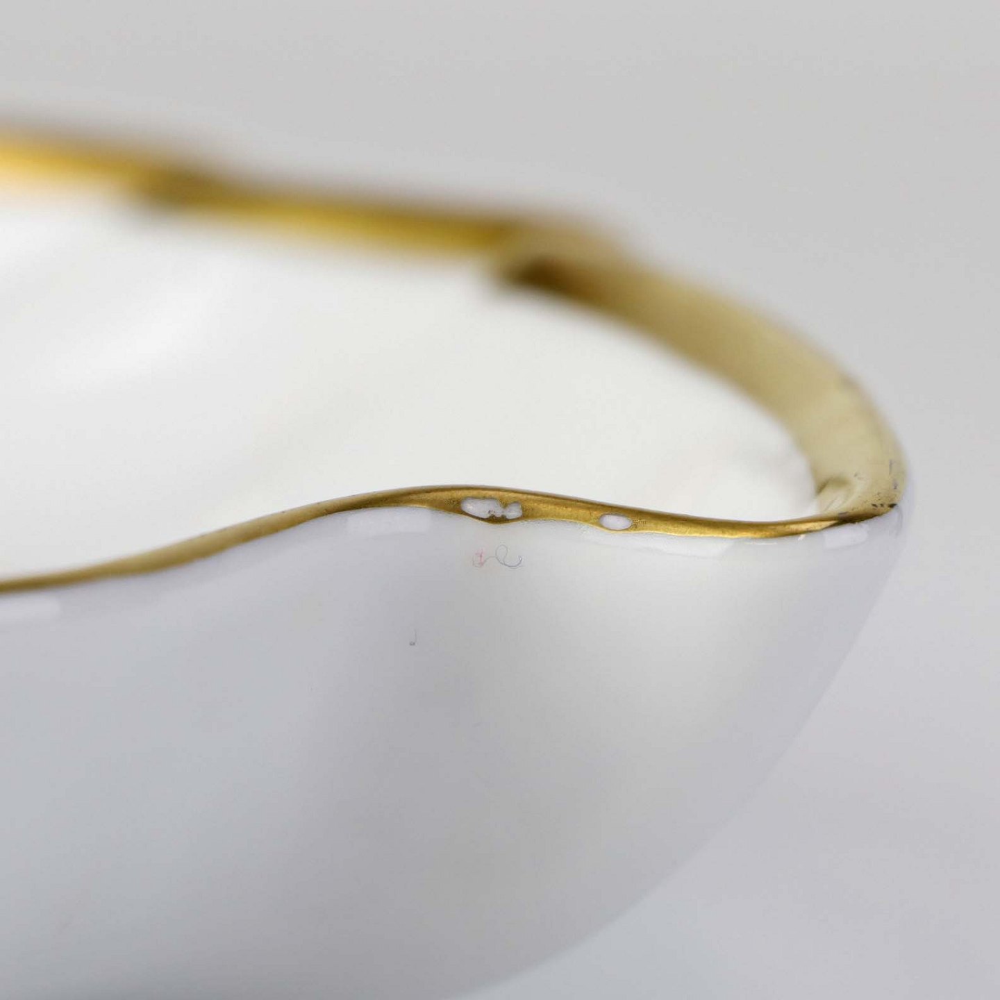 Fremstår med brugsspor på guldbort på fadets yderside.
