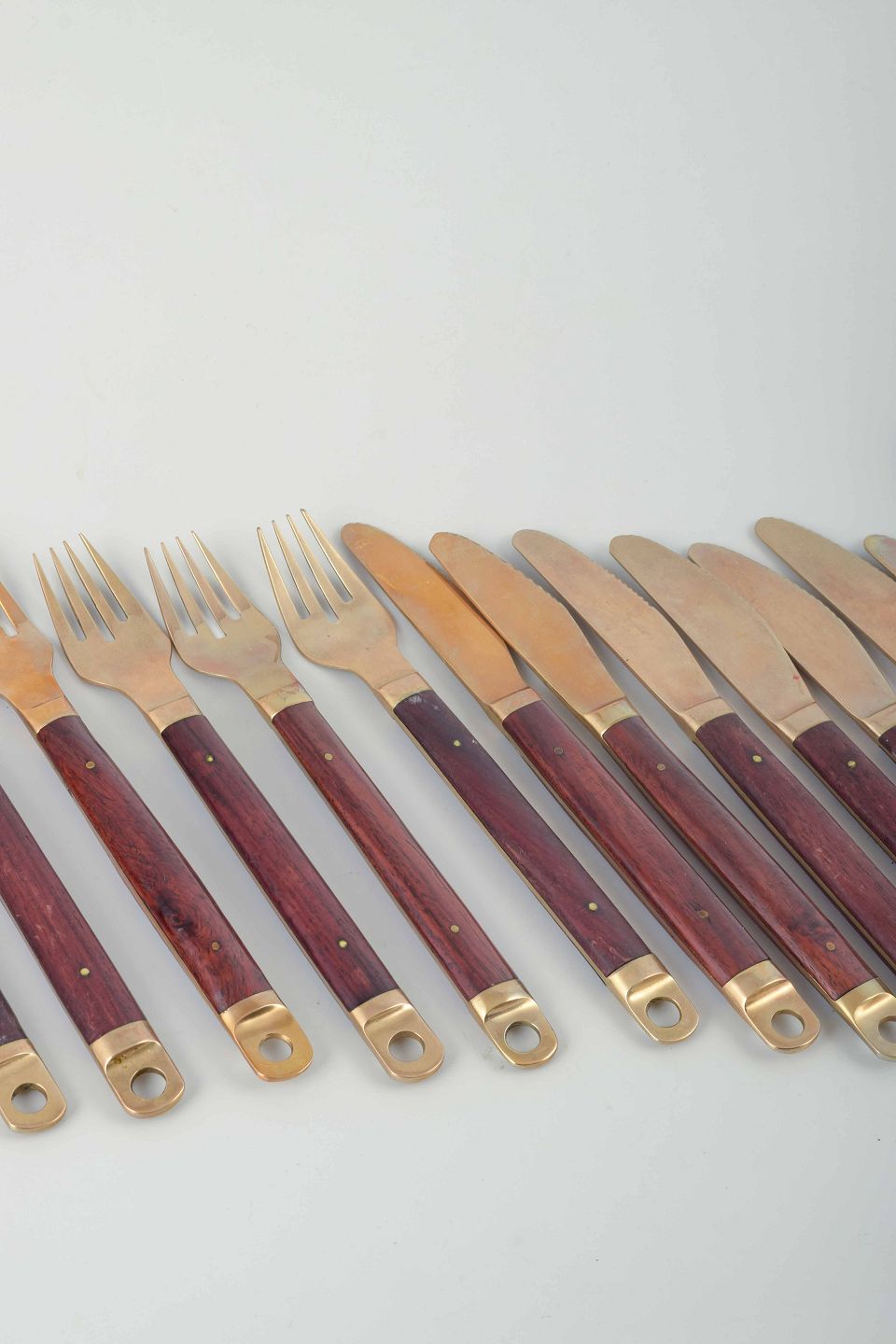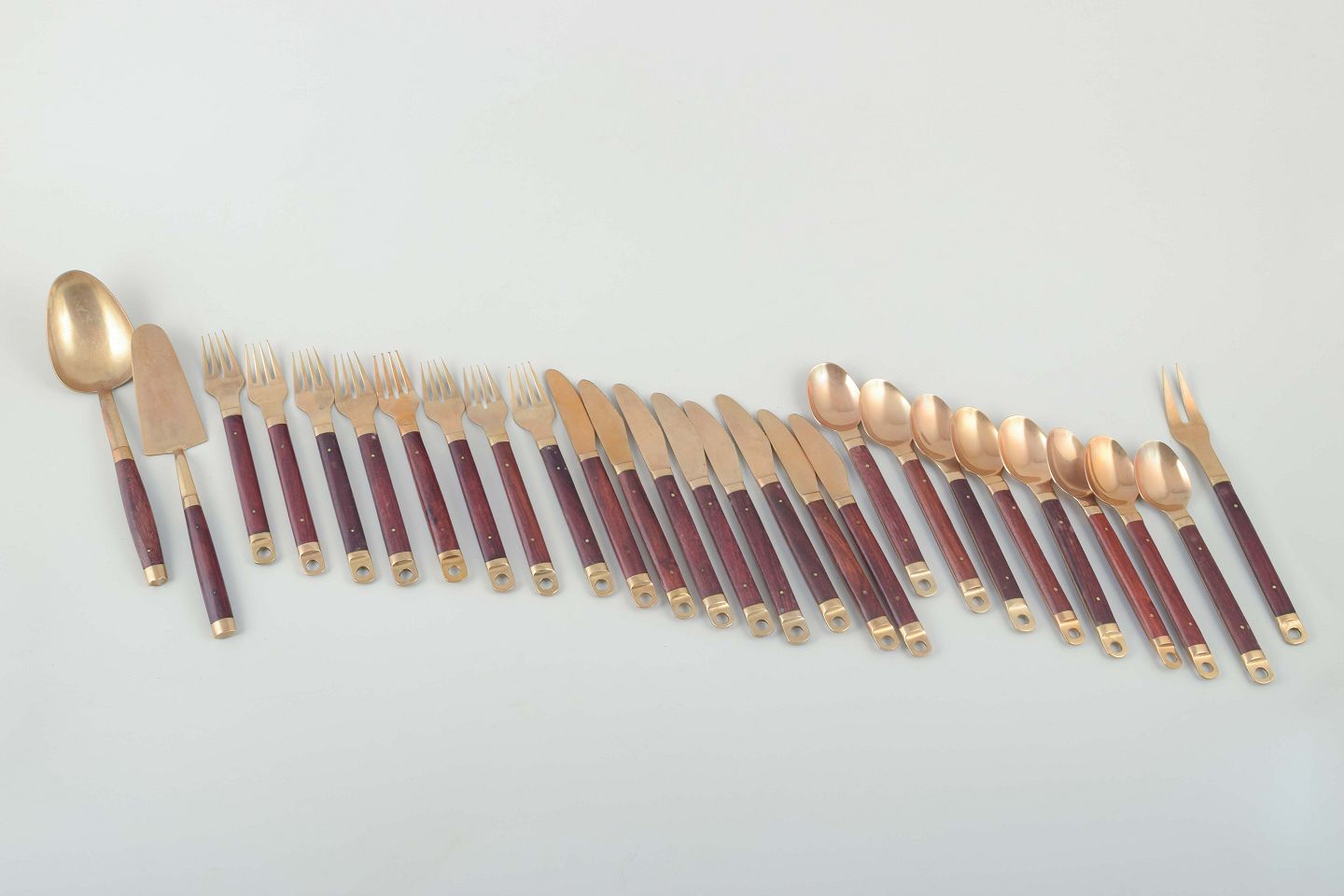 Text zugänglich auf Dänische: Brøste. Komplet 8-personers middagsbestik af bronze og rosentræ, model 222.