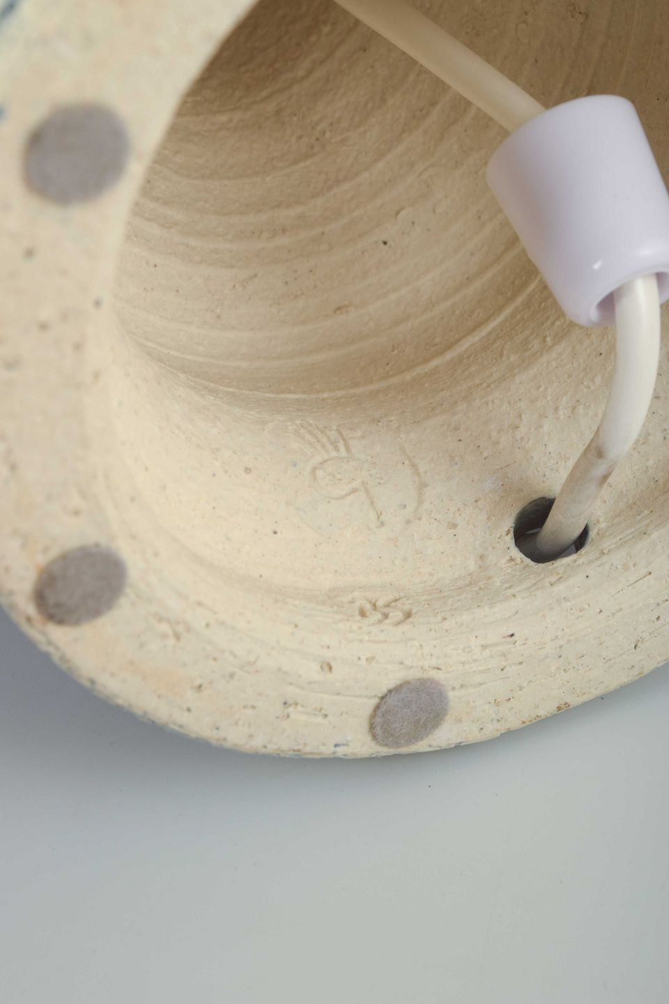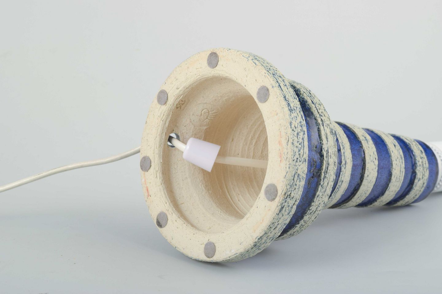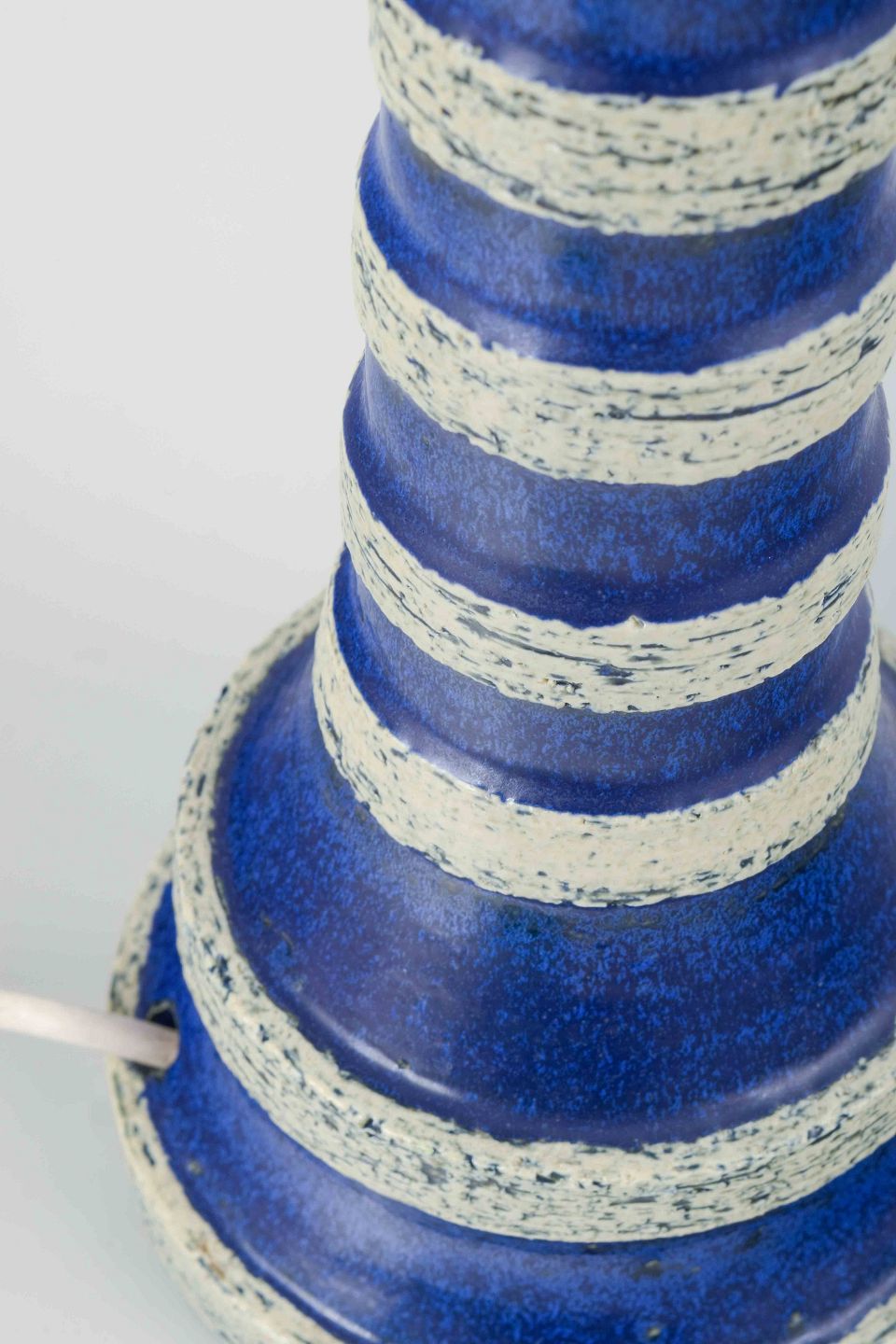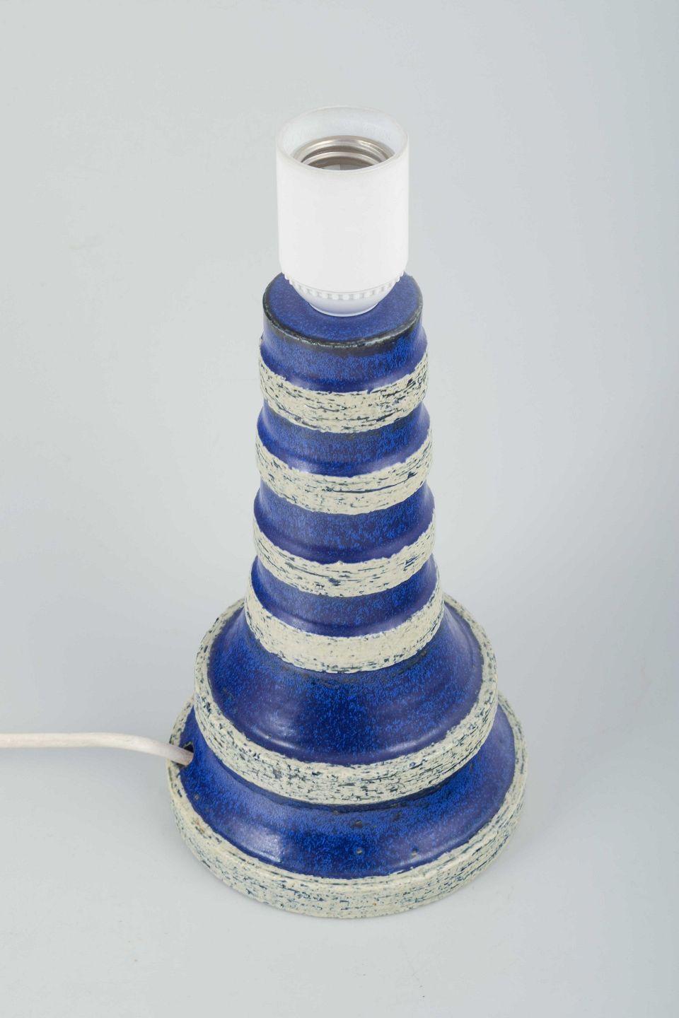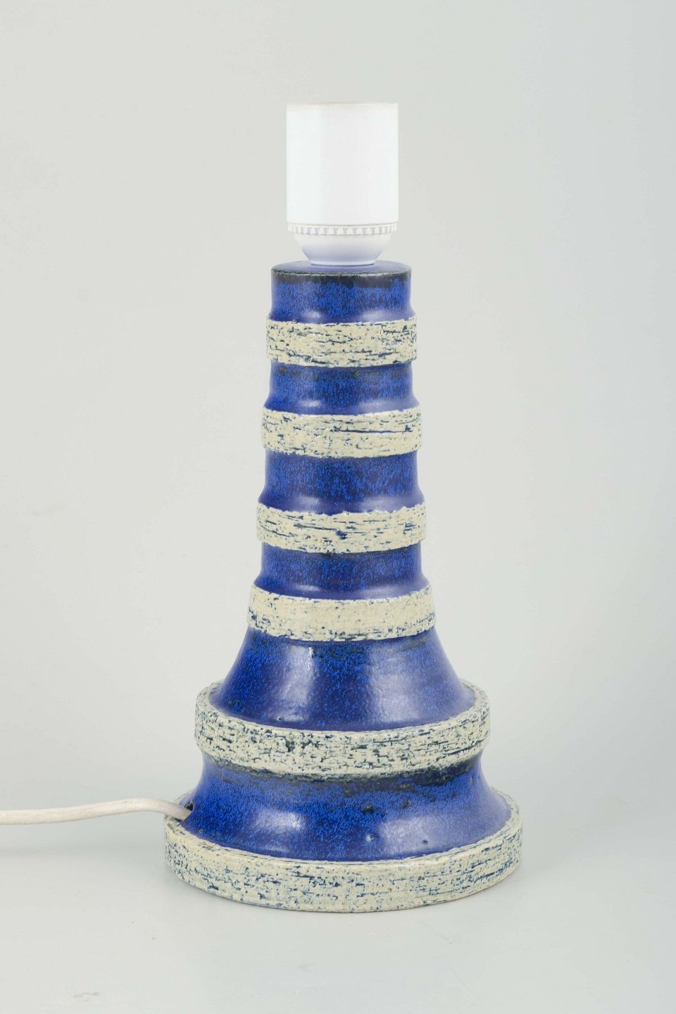 Kegleformet lampefod i stentøj med blå glasur og råhvide, reliefdekorerede bånd.