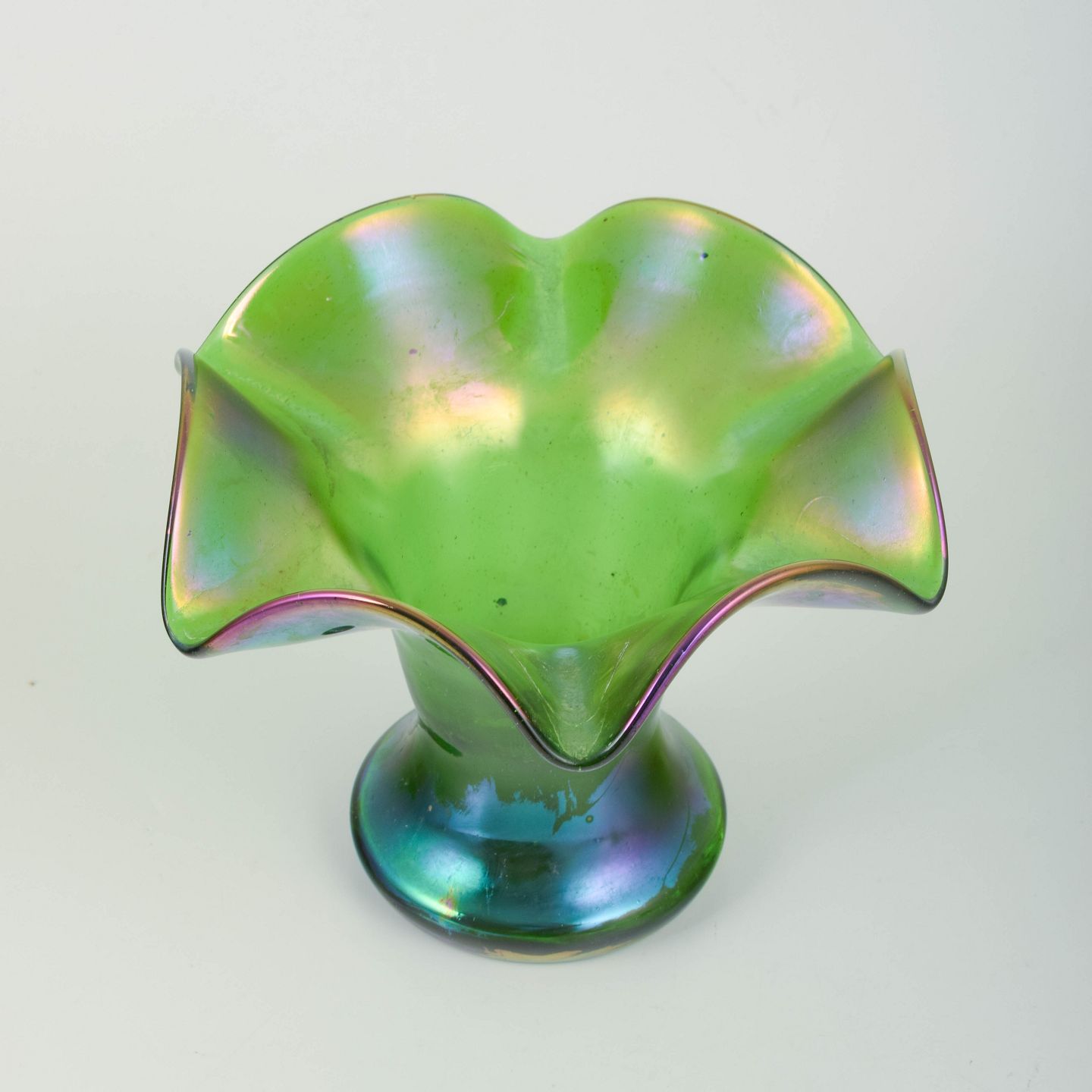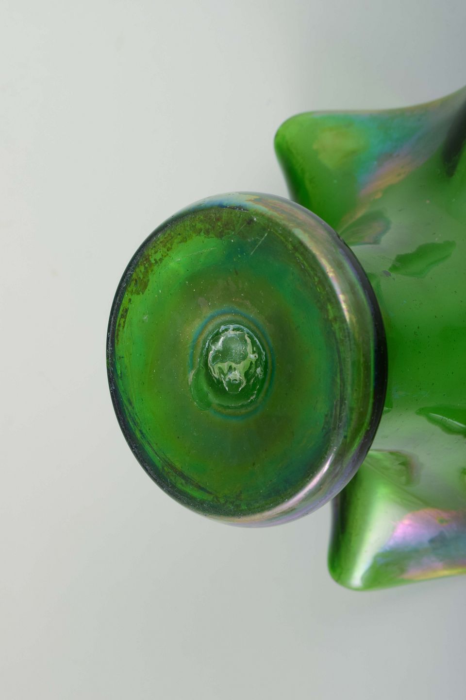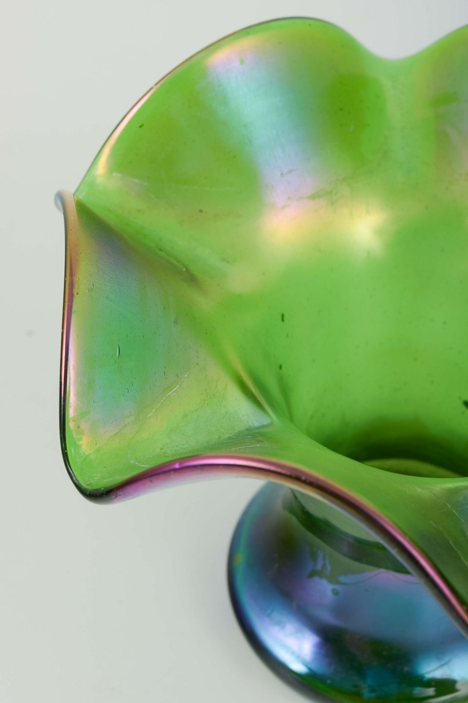 Mundblæst grøn glasvase med iriseret overflade i violet og blå toner. Organisk svunget, bølget kant. Slebet pontil under bunden.