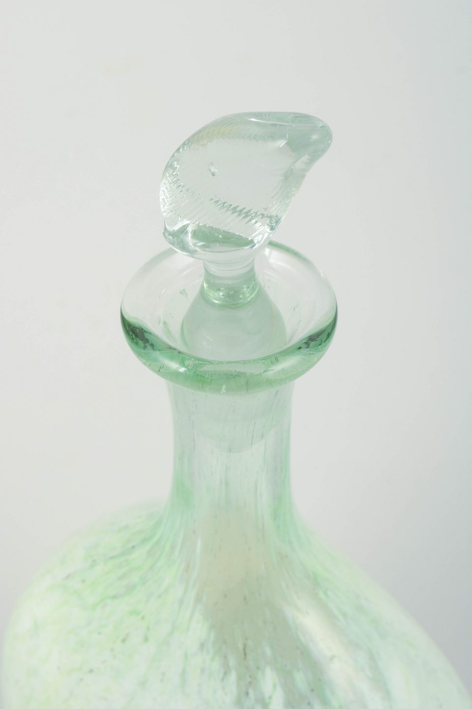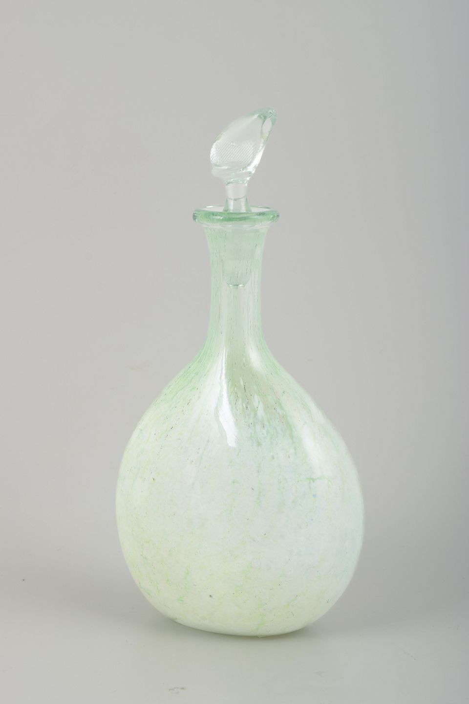 Mundblæst karaffel i klart glas med hvid- og grøntonede indslag. Original slebet prop. Slebet og indridset signatur samt årstal 1990.