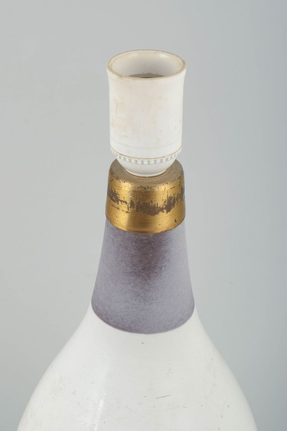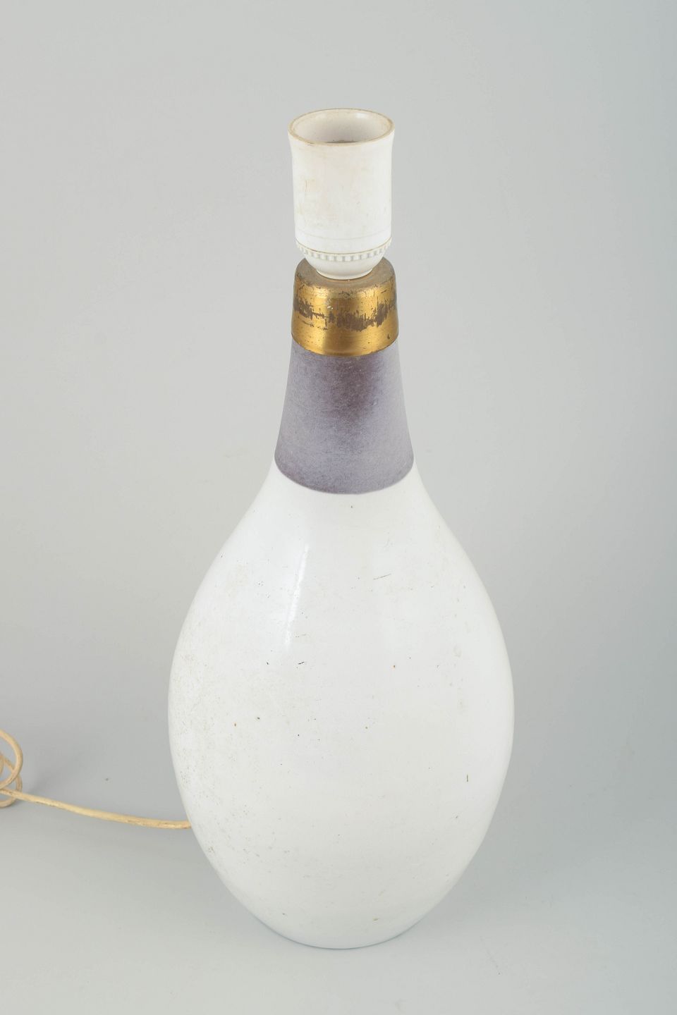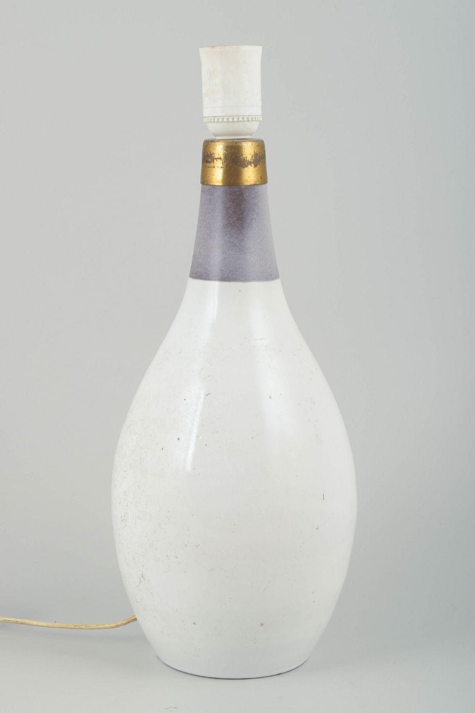 Keramisk lampefod med dråbeformet korpus i hvid glasur med mat grå hals og guldfarvet bånd. Stemplet UE, 2037 under bunden.