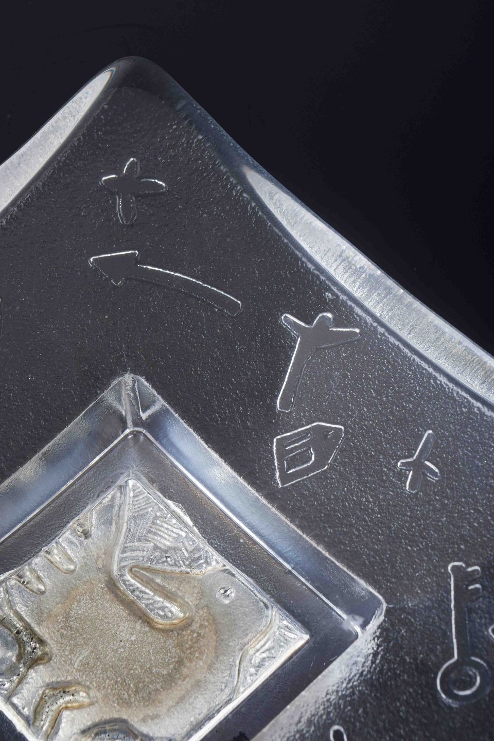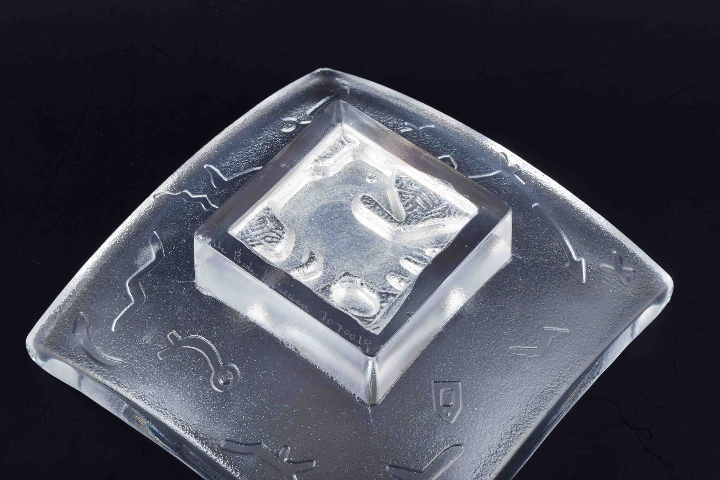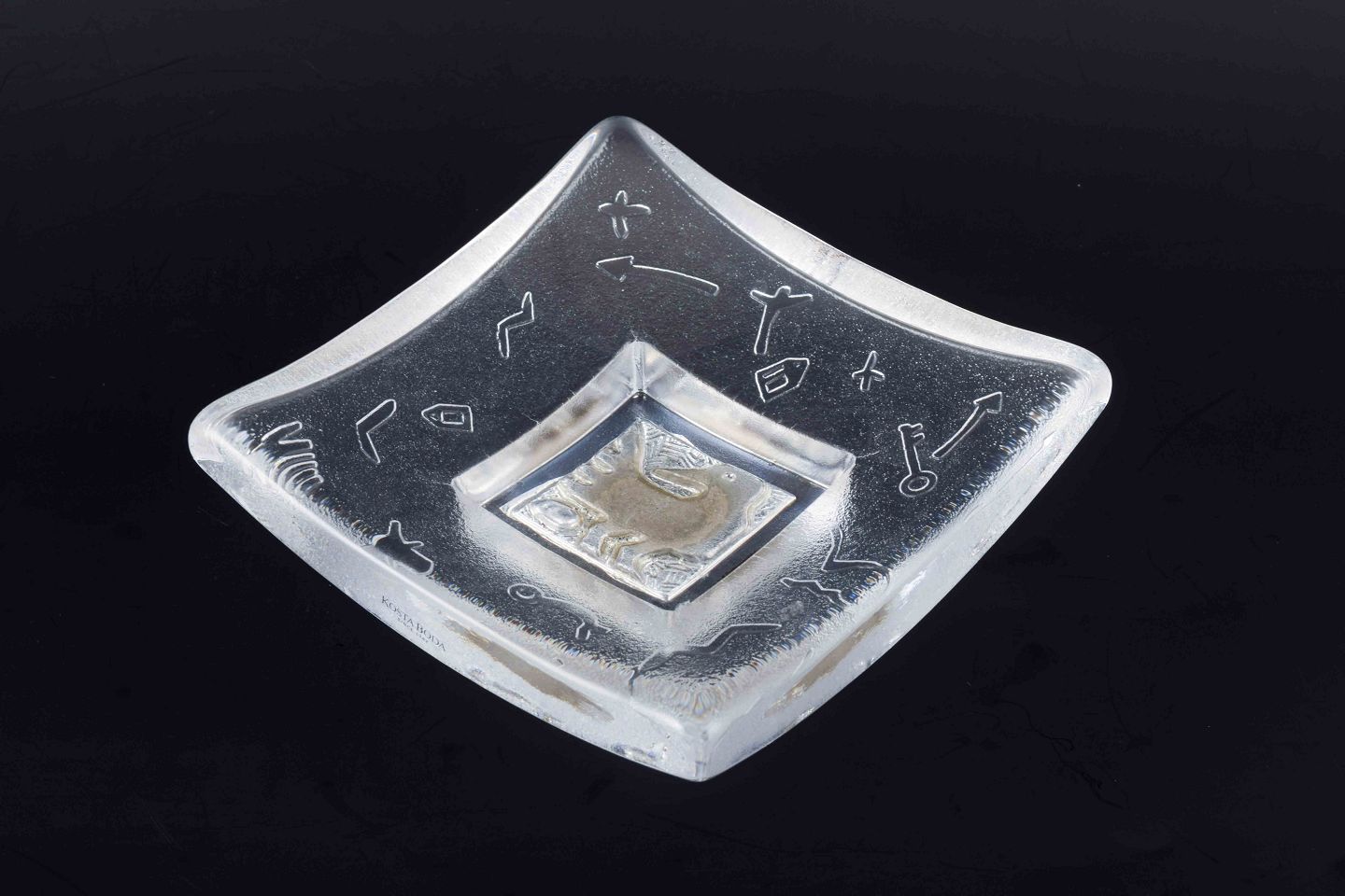Rektangulær "Domino" glasskål med svungne hjørner, transparent glas med indgraverede symboler og figurer.