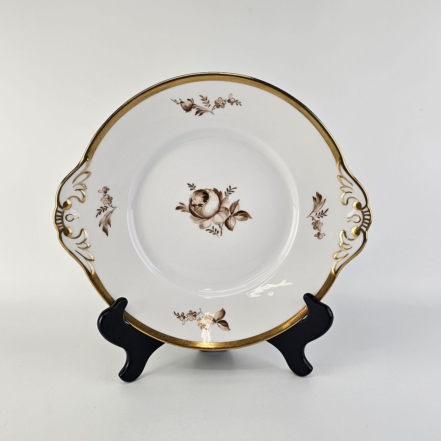 Stel i glat hvidt porcelæn dekoreret med brune roser og guldbort